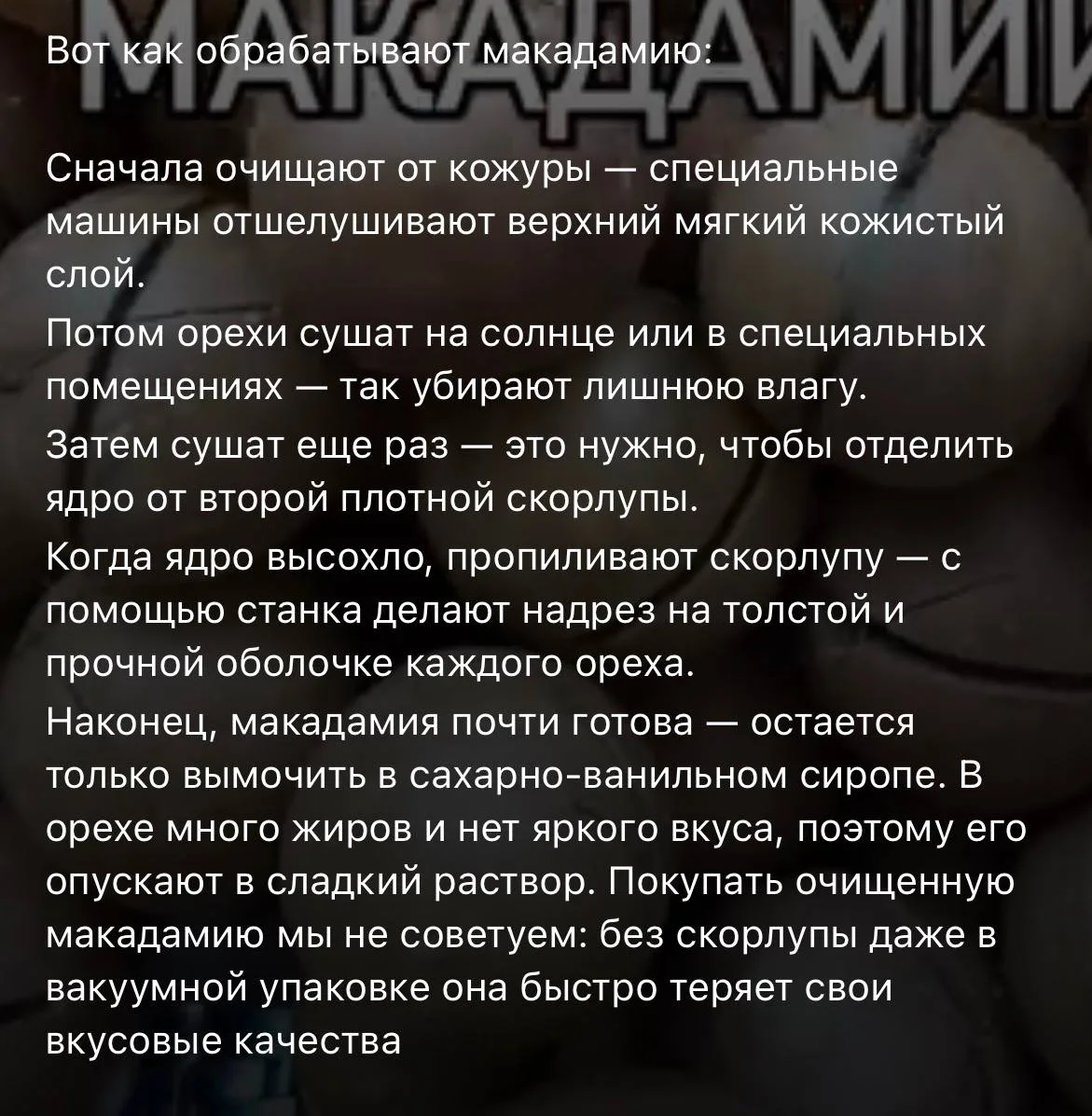 Друзья, по следам ореха макадамии выяснилось (ну лично для меня открытие, так как с этим орехом я только познакомилась) - орехи пропитывают специальным сиропом - и здесь не обошлось без шаловливых ручек любителей наживиться. А ведь я реально думала что они такие растут на дереве уникальные ароматные (наивная душа) 🤔🤦♀️😅