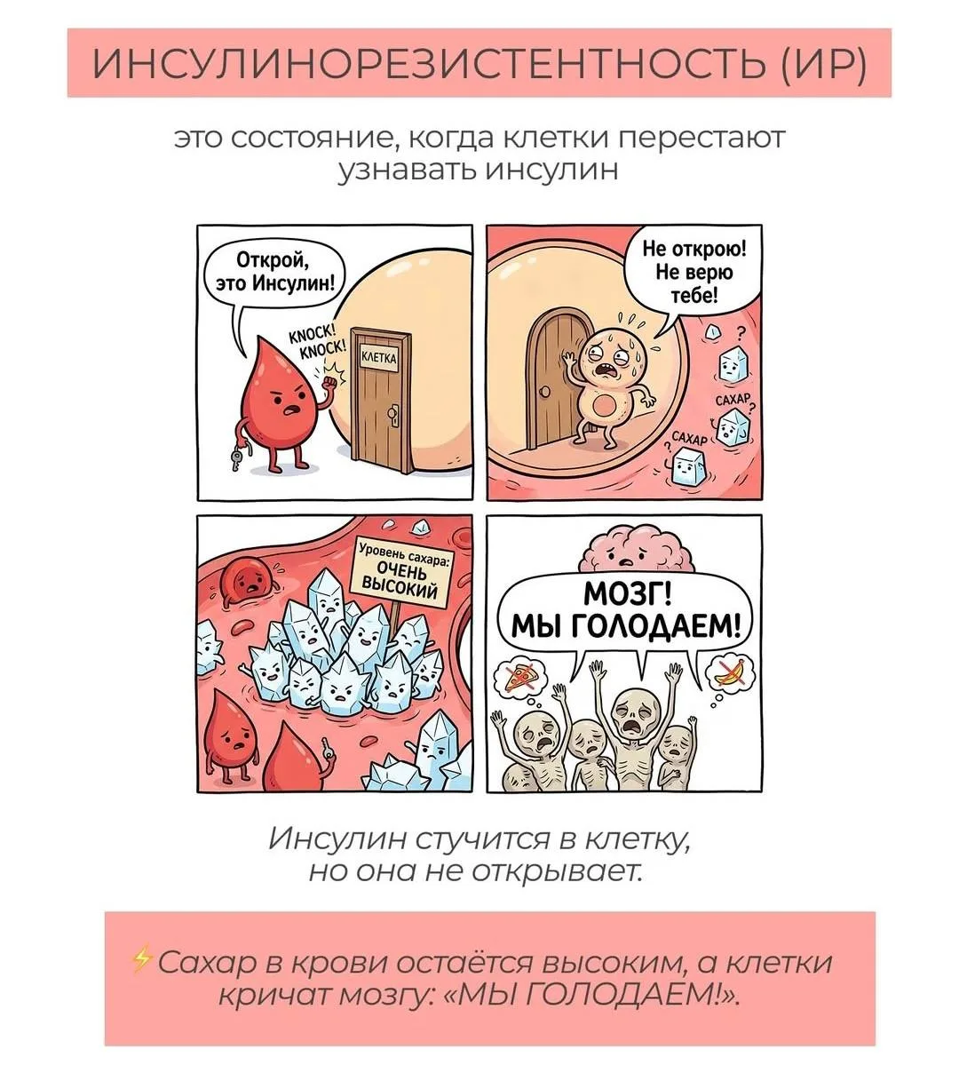 Сахар в крови остаётся высоким, а клетки кричат мозгу: «МЫ ГОЛОДАЕМ!».