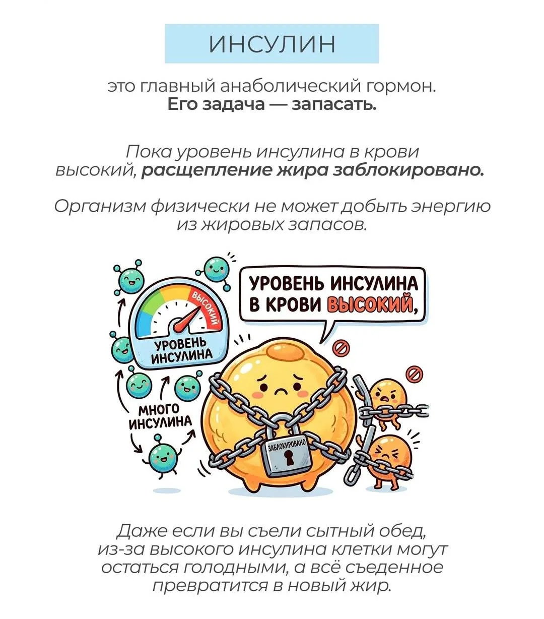 Пока уровень инсулина в крови высокий, расщепление жира заблокировано. Организм физически не может добыть энергию из жировых запасов.