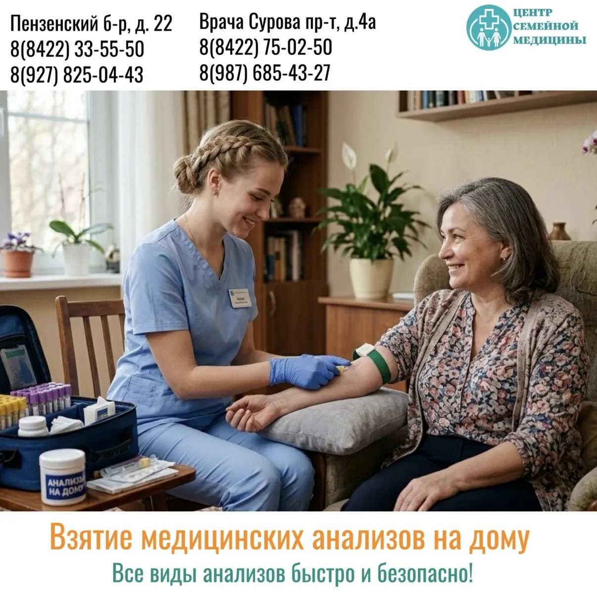 Центр семейной медицины предлагает услугу выезда медсестры на дом. Теперь сдать анализы можно в привычной, комфортной обстановке.
