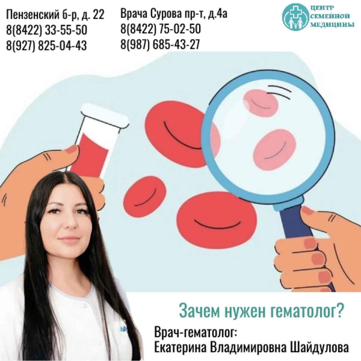 ✨В Центре семейной медицины приём ведёт Екатерина Владимировна Шайдулова — главный врач и врач-гематолог с опытом работы более 15 лет.