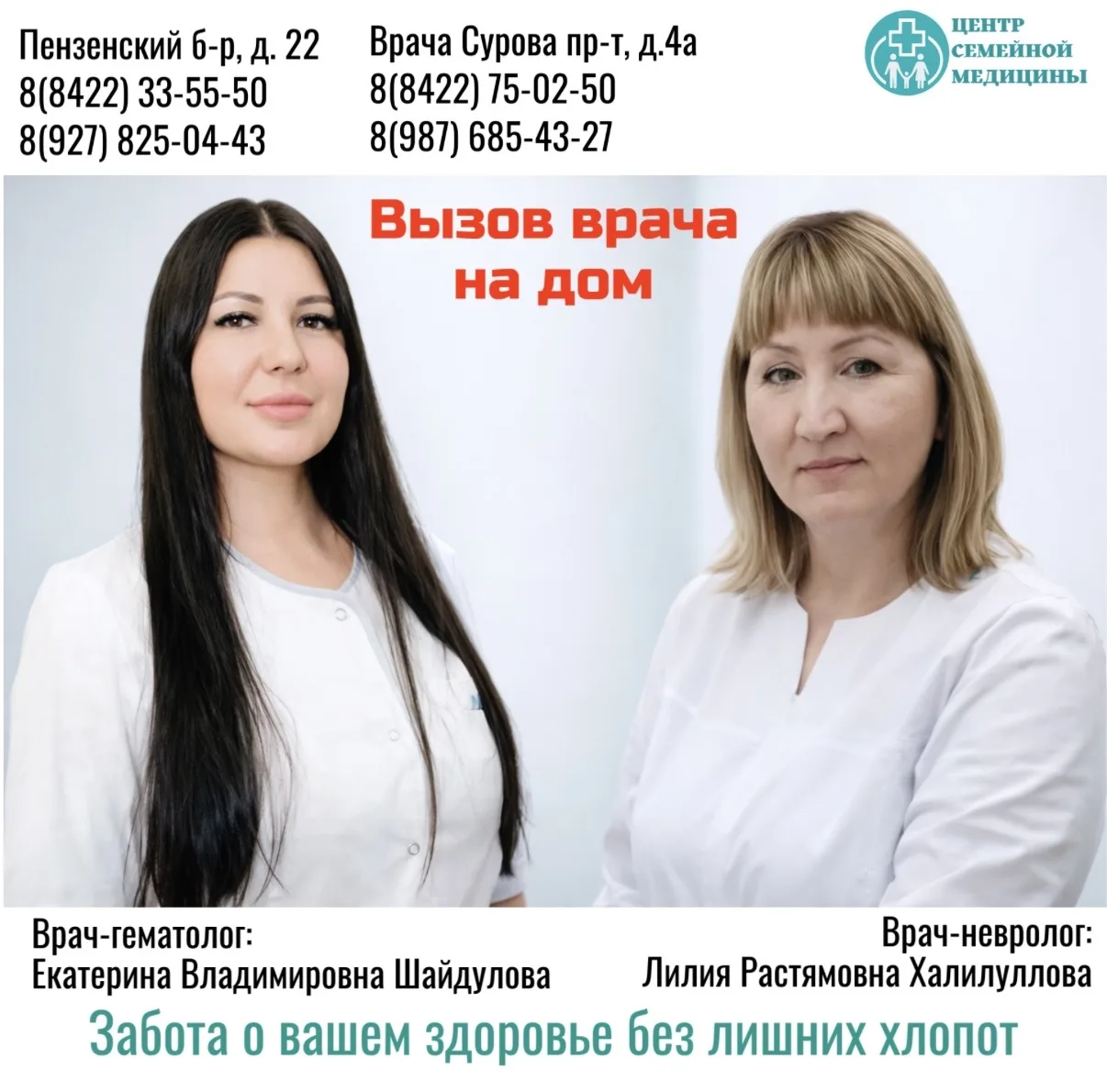 В ООО «Центр семейной медицины» вы можете вызвать врача на дом и получить квалифицированную помощь в комфортных условиях.