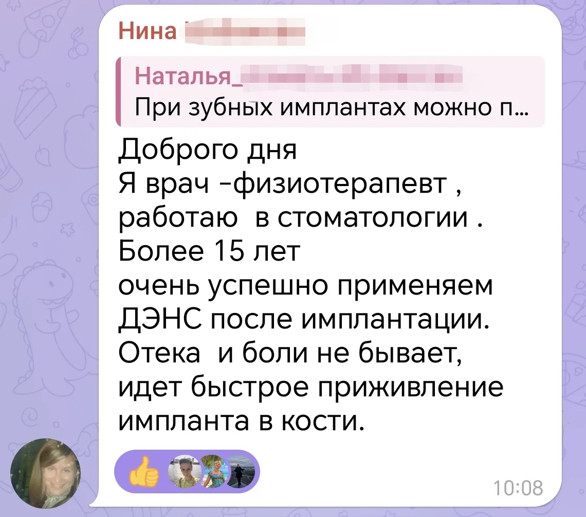 Я врач-физиотерапевт, работаю в стоматологии. Более 15 лет очень успешно применяем ДЭНС после имплантации. Отека и боли не бывает, идёт быстрое приживление импланта в кости.