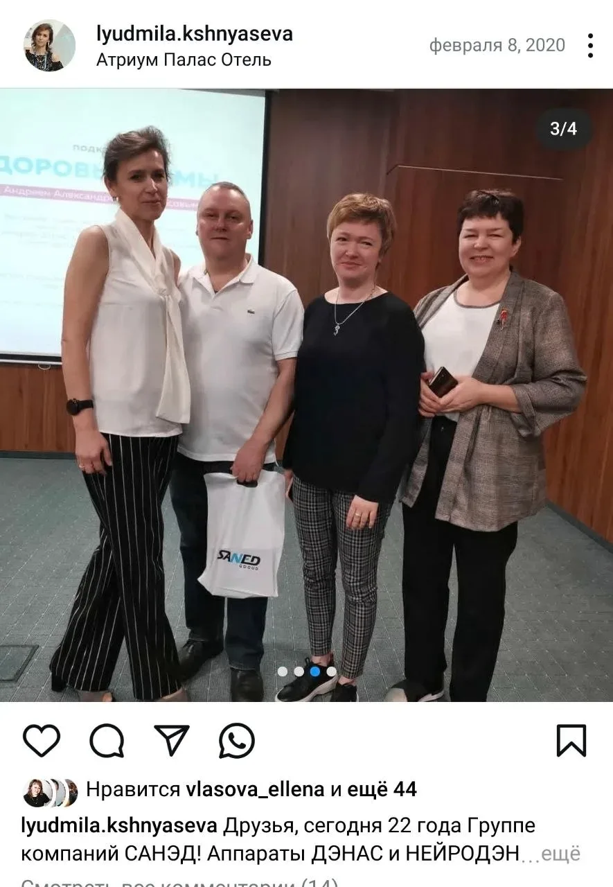 На фото слева-направо: Людмила Кшнясева (я), врачи-преподаватели, разработчики и консультанты по ДЭНАС (2020 год) Сафронов Алексей и Наталья Гольмгрен, Евгения Храмова (мой партнер и коллега в Екатеринбурге).