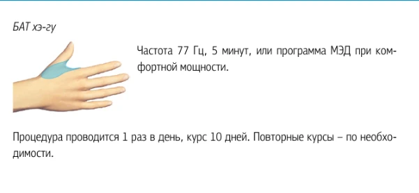 В практике с аппаратами ДЭНАС точка Хэ-гу используется довольно часто. Если мы заглянем в руководство, то почти в каждой рекомендованной схеме присутствует Хэ-гу (пример на рисунке выше).