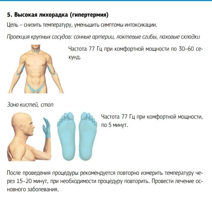 ⇲ А вот если вы чётко понимаете, что температура тела поднялась вследствие простуды, например, то тогда берём в руки аппарат, чтобы температуру снизить.