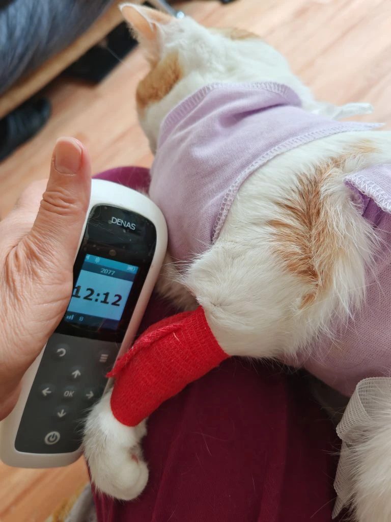 Я взяла аппарат НЕЙРОДЭНС-ПКМ, который был дома, просидела с ней минут 50, работала по лапке - Су Джок проекция всего тела, живота в том числе. Режим работы взяла 77 Гц и 7720 (на лапе есть отечность после катетера).