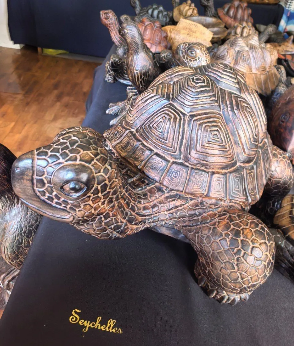 На фото символ Сейшелл - гигантская черепаха - поделка местных ремесленников.