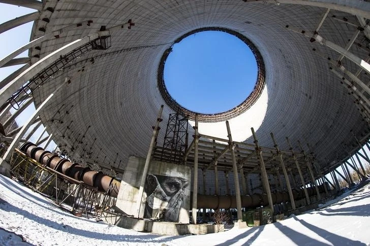 Внутри градирни был нарисован интересный мурал (последнее фото) примерно 14 лет назад. На стене изобразили киевского хирурга, делавшего операцию одному из пожарных Чернобыльской аварии. К слову, пожарный выжил после операции. А оригинал фото был сделан фотографом Игорем Костиным.