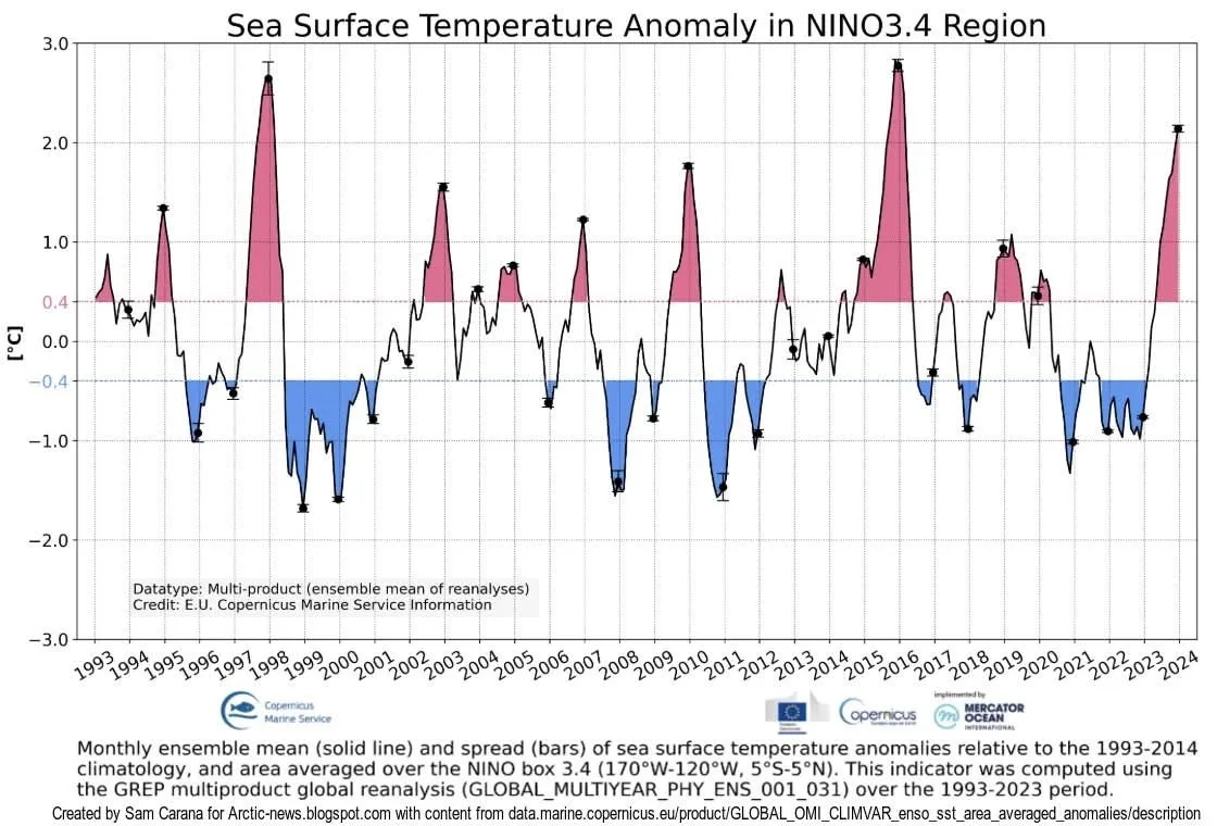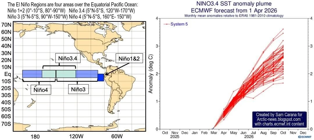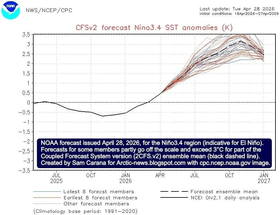 График региона Niño3.4 выглядит так, будто кто-то забыл вовремя остановиться. Прогнозы выходят за рамки приличий и стандартных шкал, а ансамбль CFS.v2 рисует черную пунктирную линию, уверенно пробивающую отметку в +3°C. Видимо, Эль-Ниньо 2026 года всерьез вознамерился утереть нос легендарным бедствиям 1997/98 и 2015/16. Мол, смотрите, как надо разогревать планету, а не вот это вот всё.