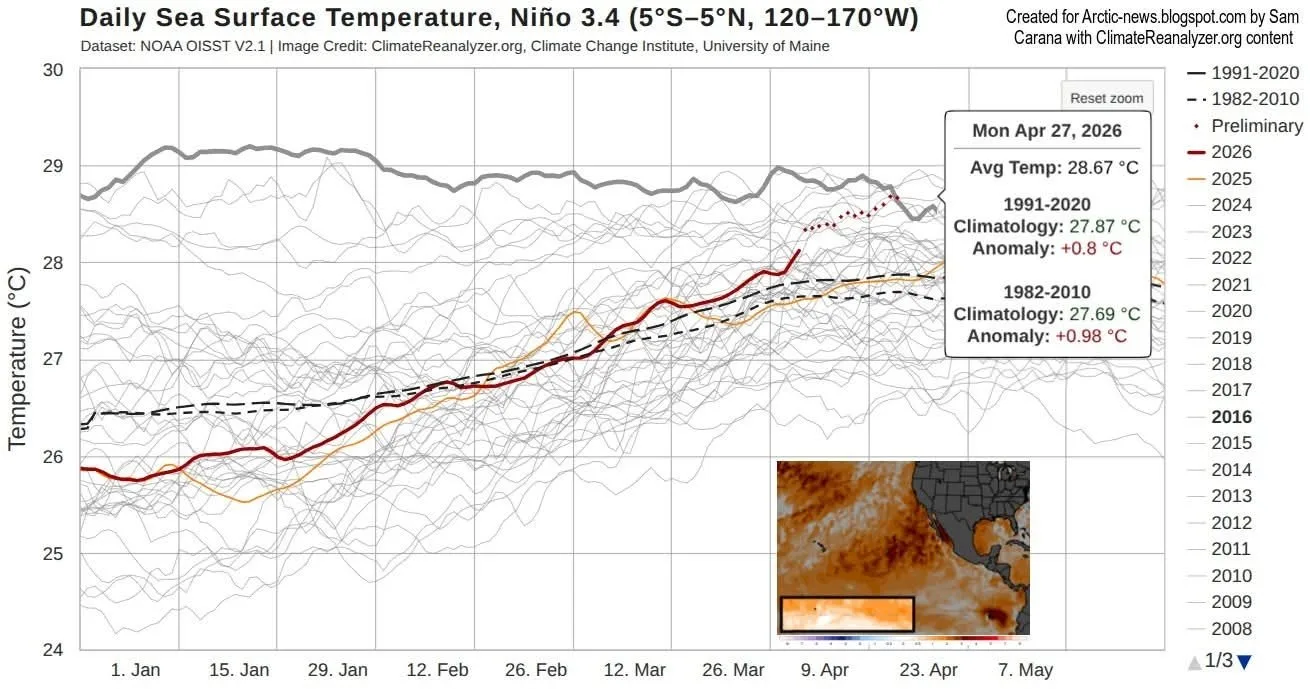 Природа снова решила напомнить, кто в этом доме хозяин, а заодно подкинуть нам сюжет для очередной паники. Судя по свежим данным от 28 апреля 2026 года, нас ждет не просто теплая водичка в Тихом океане, а полноценный климатический апокалипсис локального значения.