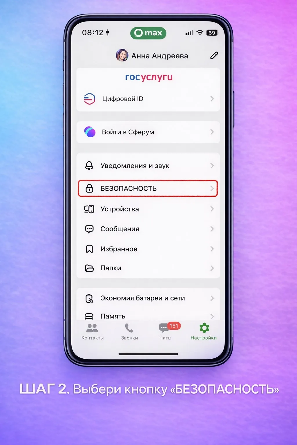 2. Нажми на «Безопасность»