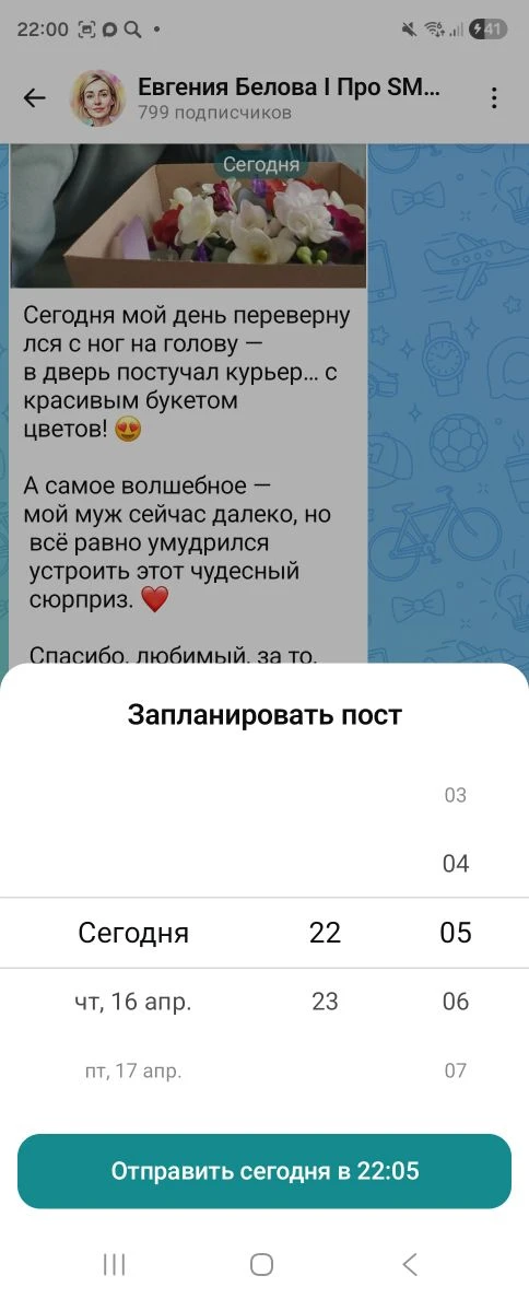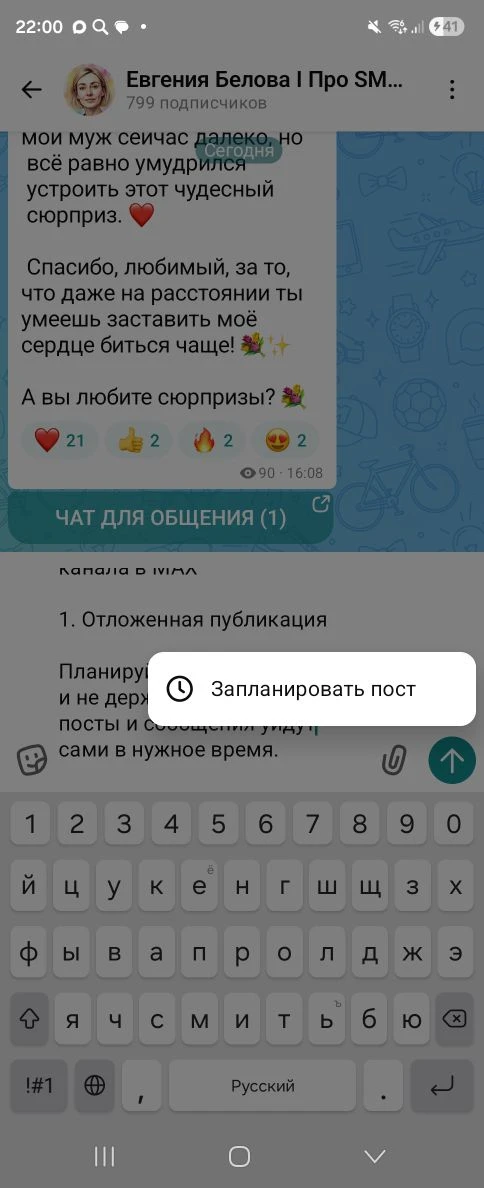 ✅ выбираем «Запланировать пост» (в канале) или «Отправить позже» (в чате)