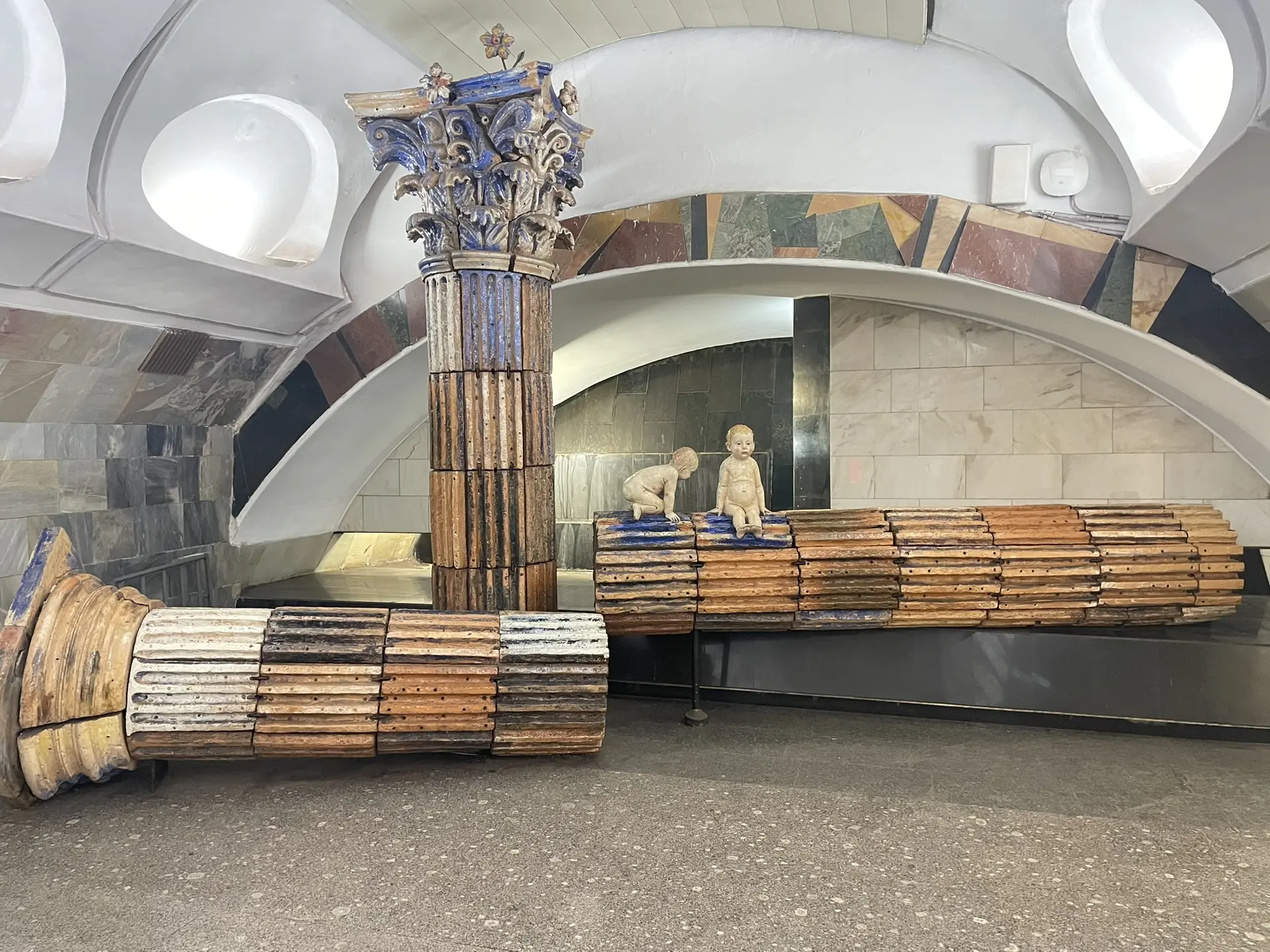 1. «Ромул и Рем, восседающие на колонне» — главная композиция, расположенная в южном торце станции. Она изображает двух братьев-близнецов, которые, согласно легенде, основали Рим в 754 году до н. э. Фигуры мальчиков сидят на обломках коринфской колонны. За ними расположен работающий фонтан — единственный в московском метро.