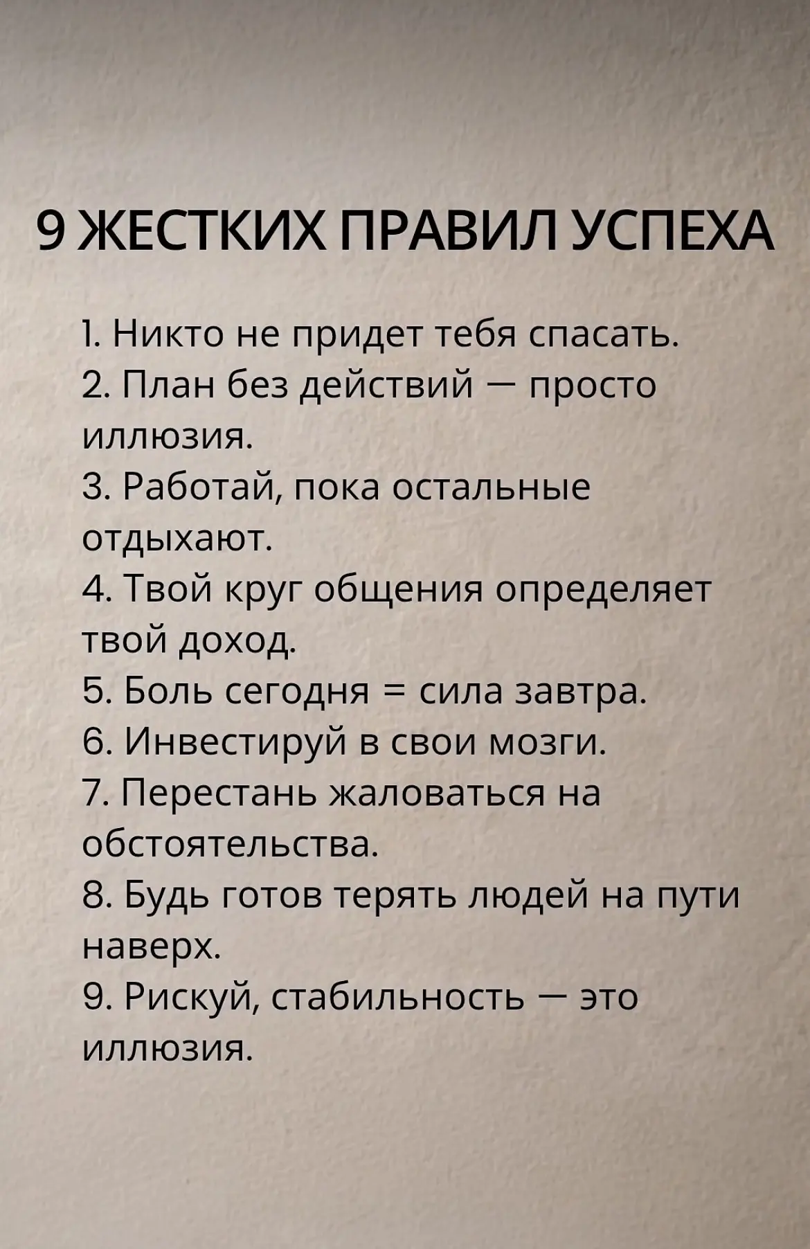Перед вами 9 жёстких правил — без воды и сантиментов. Они сформулированы так резко,потому что жизнь тоже не щадит. Эти принципы помогут вам: