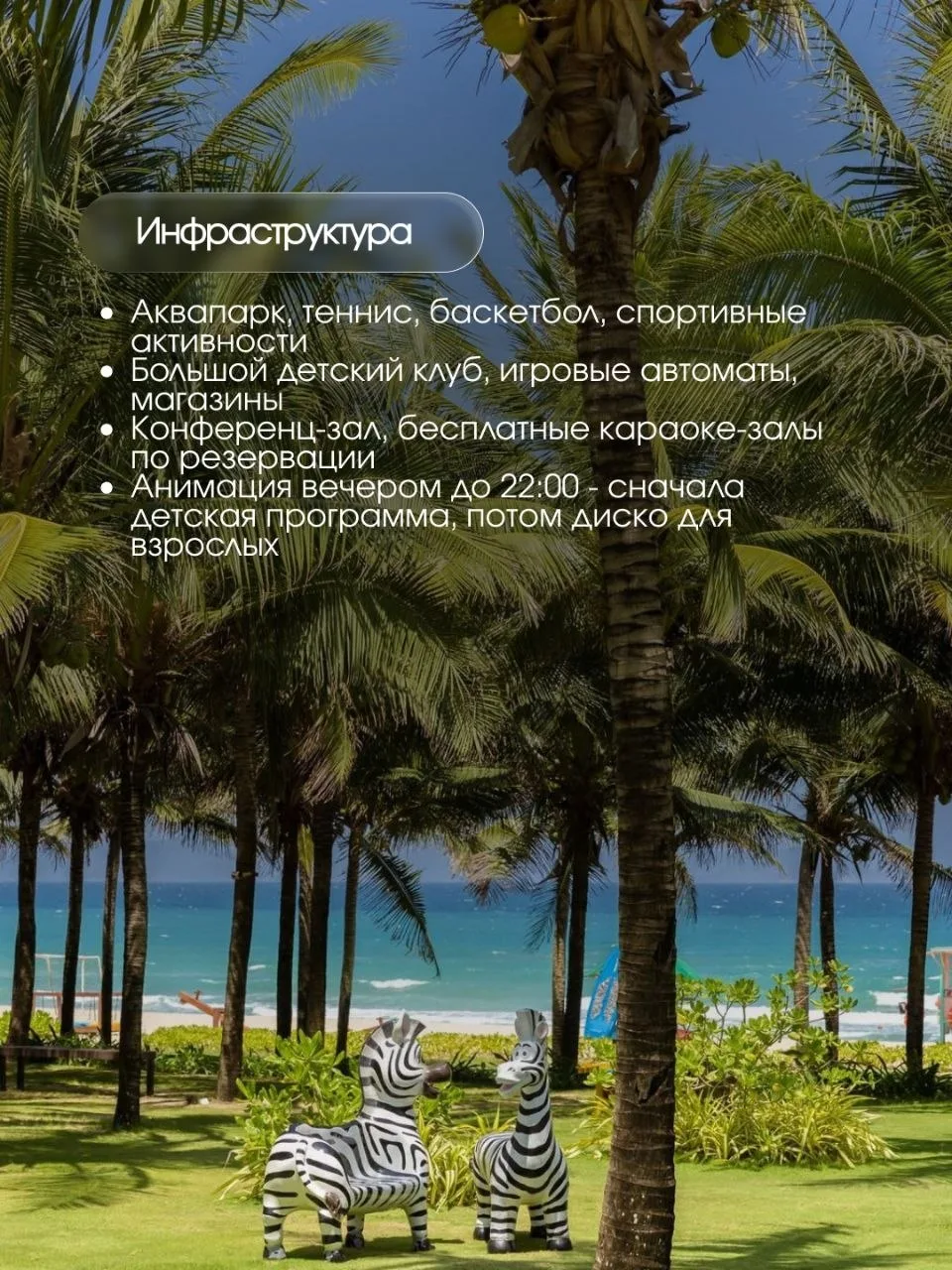 🌅Инфраструктура. Аквапарк, теннис, баскетбол, спортивные активности. Большой детский клуб, игровые автоматы, магазины. Большой конференц-зал. Караоке-залы - бесплатно по предварительной резервации 🎤