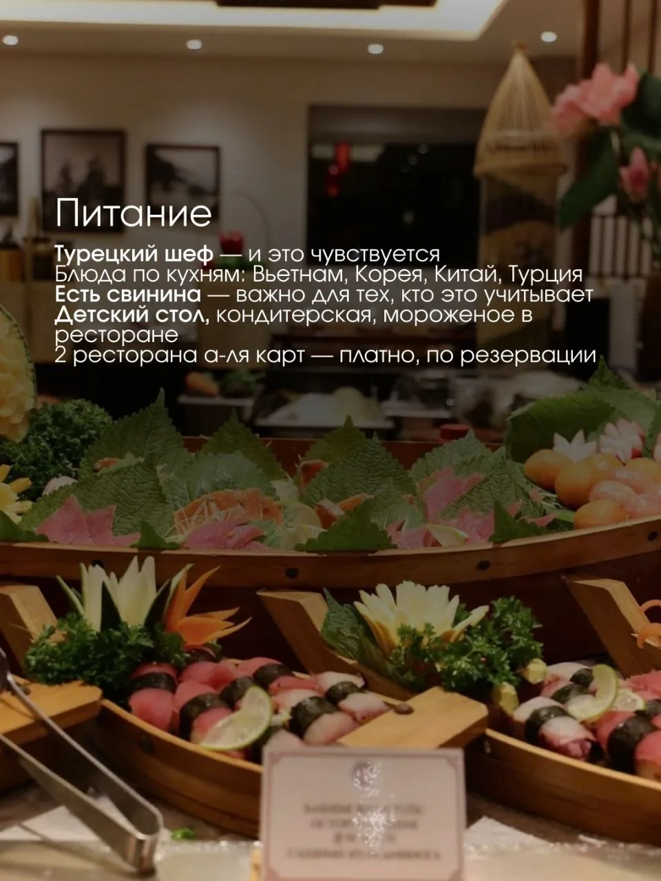 🥙Питание. Турецкий шеф - и это чувствуется. Блюда разложены по кухням: Вьетнам, Корея, Китай, Турция. Есть свинина - важно для тех, кто это учитывает. Детский стол, кондитерская, мороженое в ресторане. 2 ресторана а-ля карт - платно, по резервации. По напиткам на системе «всё включено» дают отдельное меню в барах с местным алкоголем.