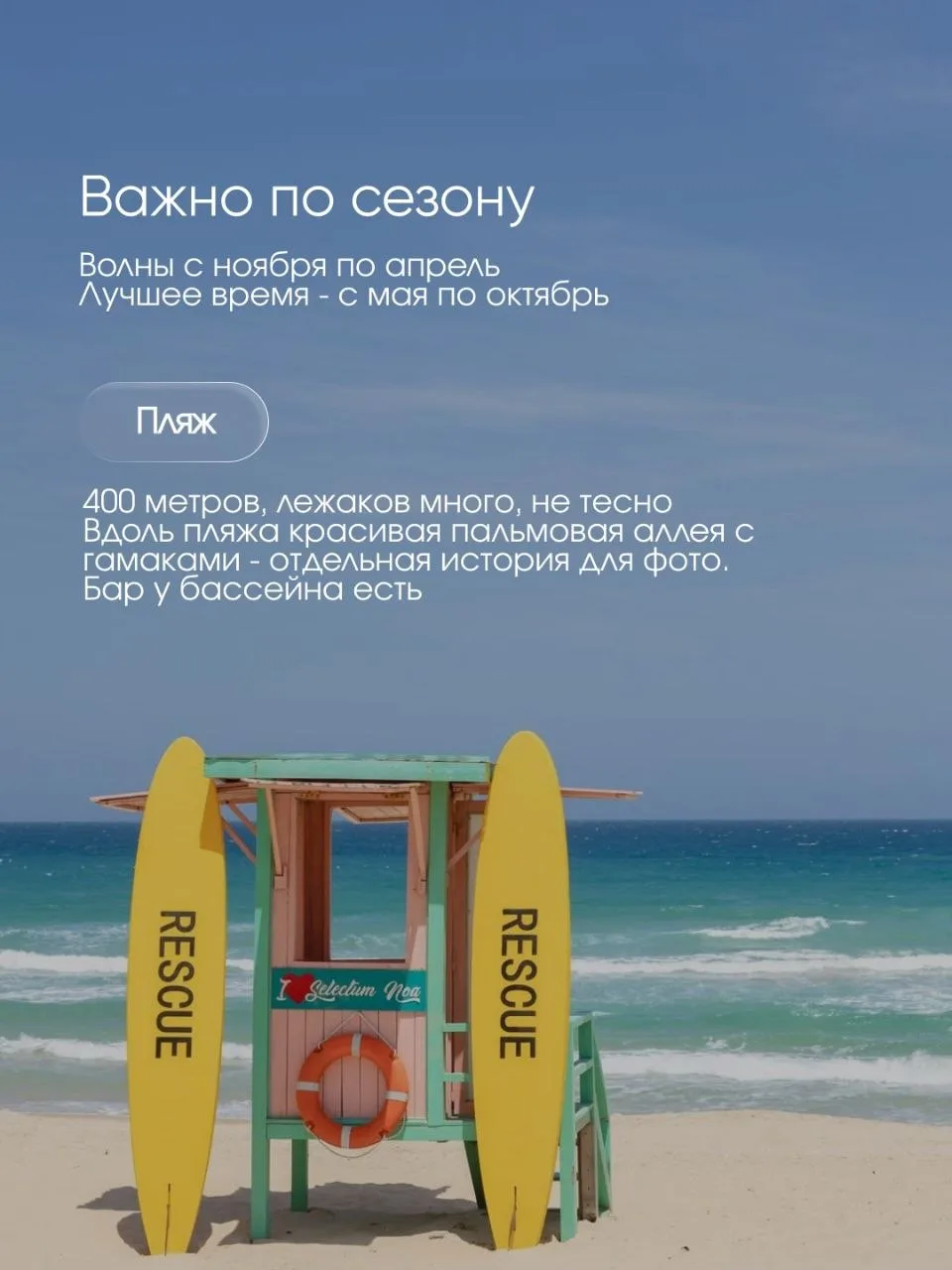 ☀️Важно по сезону. Волны с ноября по апрель. Лучшее время - с мая по октябрь.