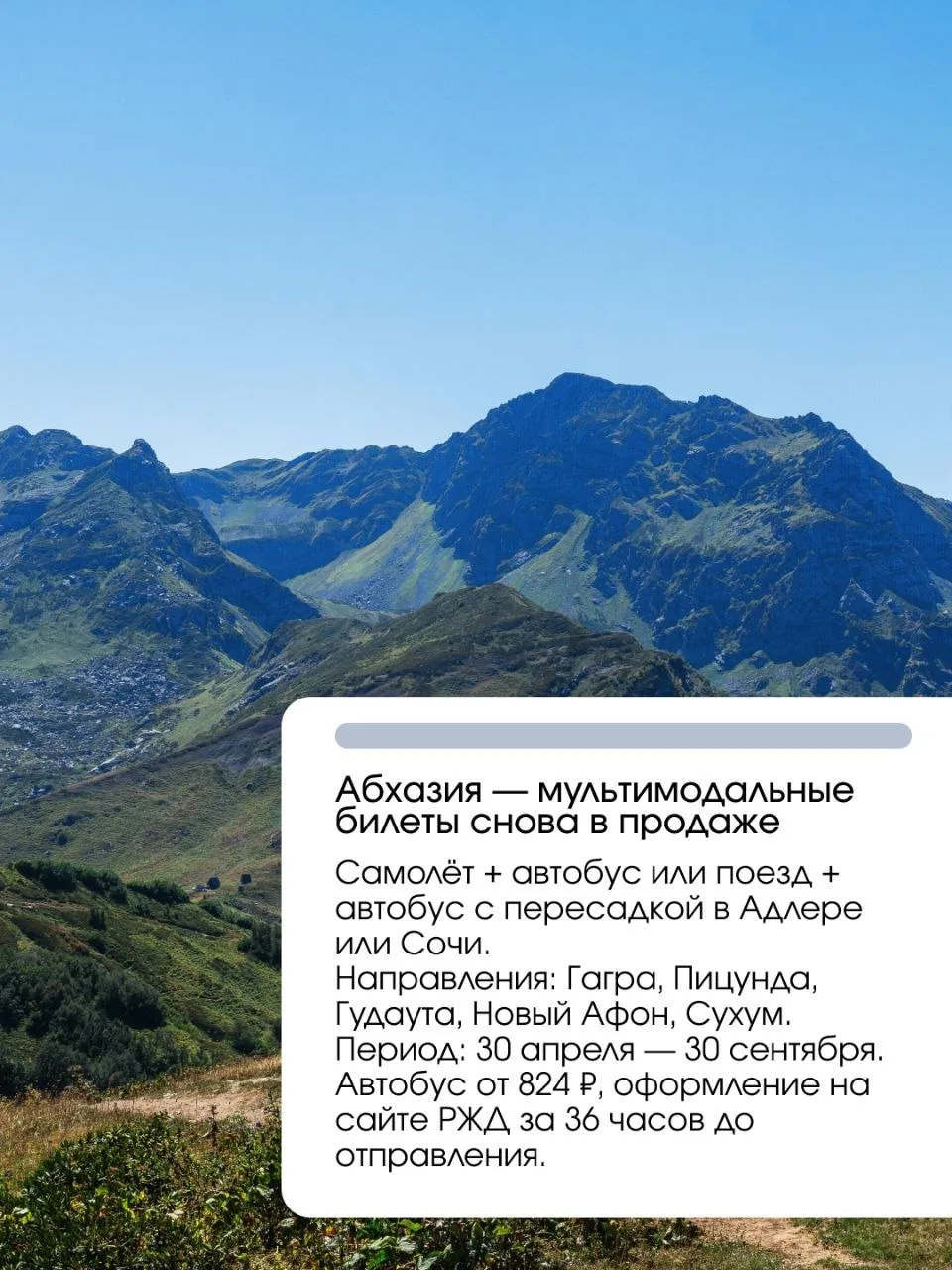 🚌 Абхазия — мультимодальные билеты снова в продаже Самолёт + автобус или поезд + автобус с пересадкой в Адлере или Сочи. Направления: Гагра, Пицунда, Гудаута, Новый Афон, Сухум. Период: 30 апреля — 30 сентября. Автобус от 824 ₽, оформление на сайте РЖД за 36 часов до отправления.
