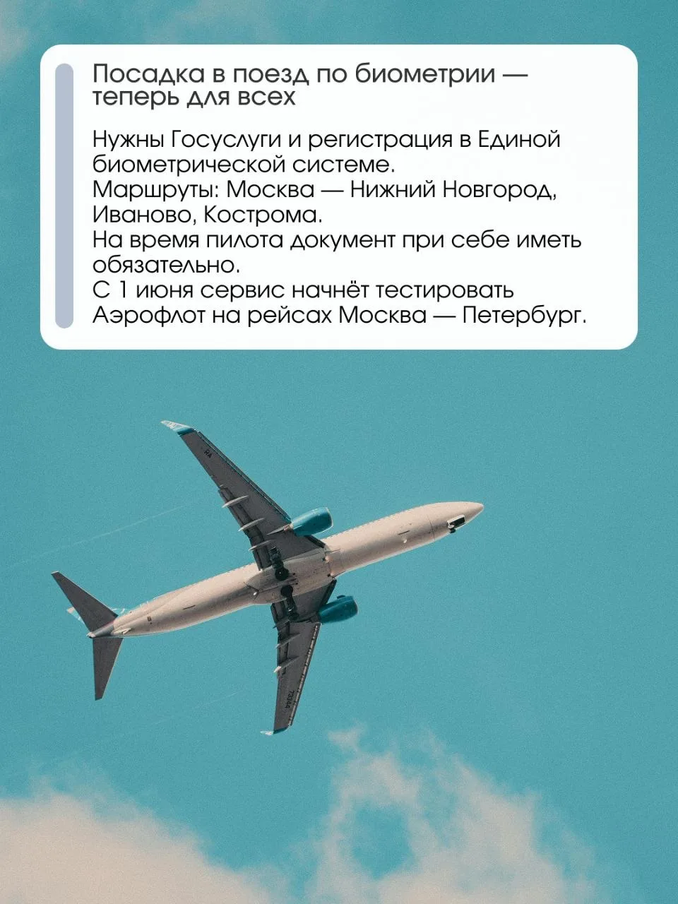 Нужны Госуслуги и регистрация в Единой биометрической системе. Маршруты: Москва — Нижний Новгород, Иваново, Кострома. На время пилота документ при себе иметь обязательно. С 1 июня сервис начнёт тестировать Аэрофлот на рейсах Москва — Петербург.