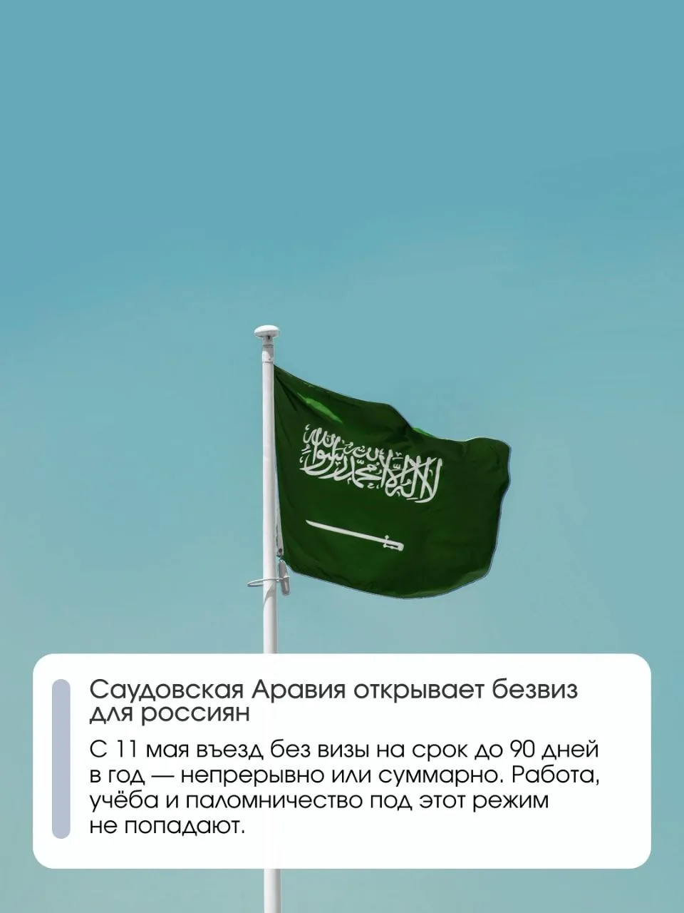 🇸🇦 Саудовская Аравия открывает безвиз для россиян С 11 мая въезд без визы на срок до 90 дней в год — непрерывно или суммарно. Работа, учёба и паломничество под этот режим не попадают.