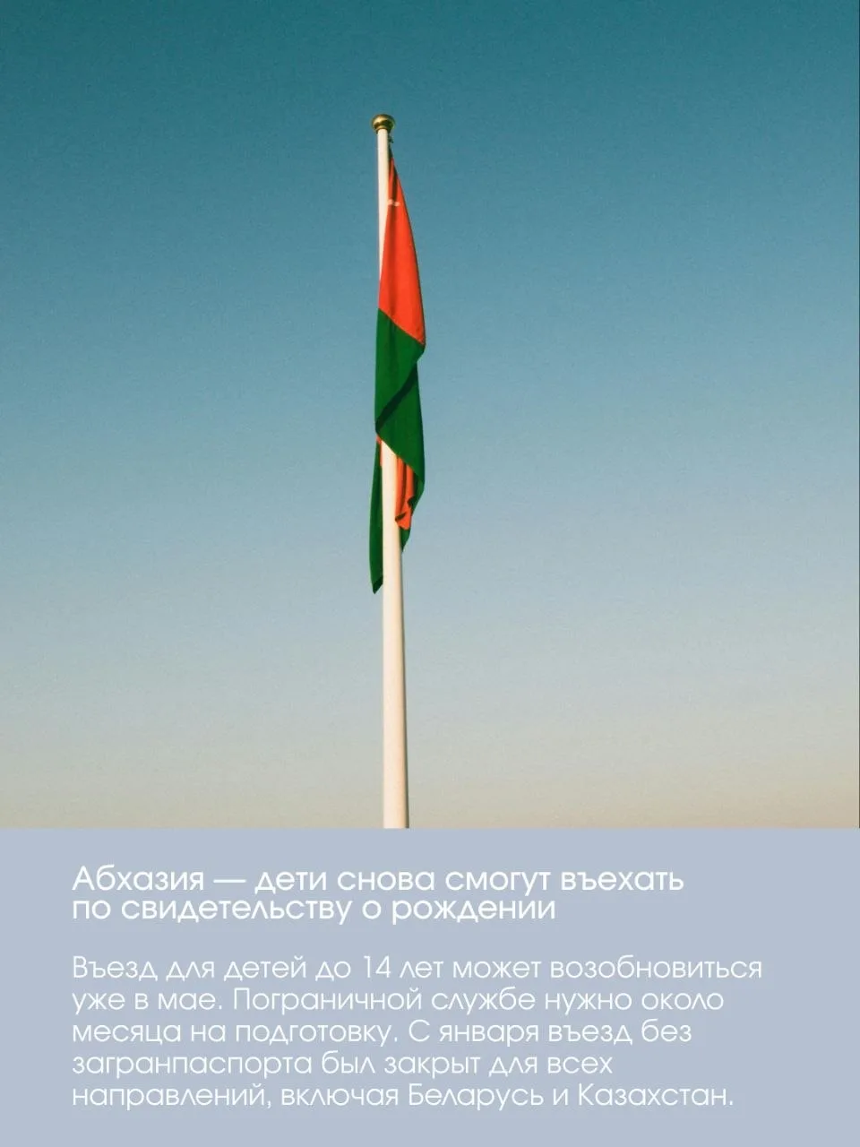 🇷🇺 Абхазия — дети снова смогут въехать по свидетельству о рождении Въезд для детей до 14 лет может возобновиться уже в мае. Пограничной службе нужно около месяца на подготовку. С января въезд без загранпаспорта был закрыт для всех направлений, включая Беларусь и Казахстан.