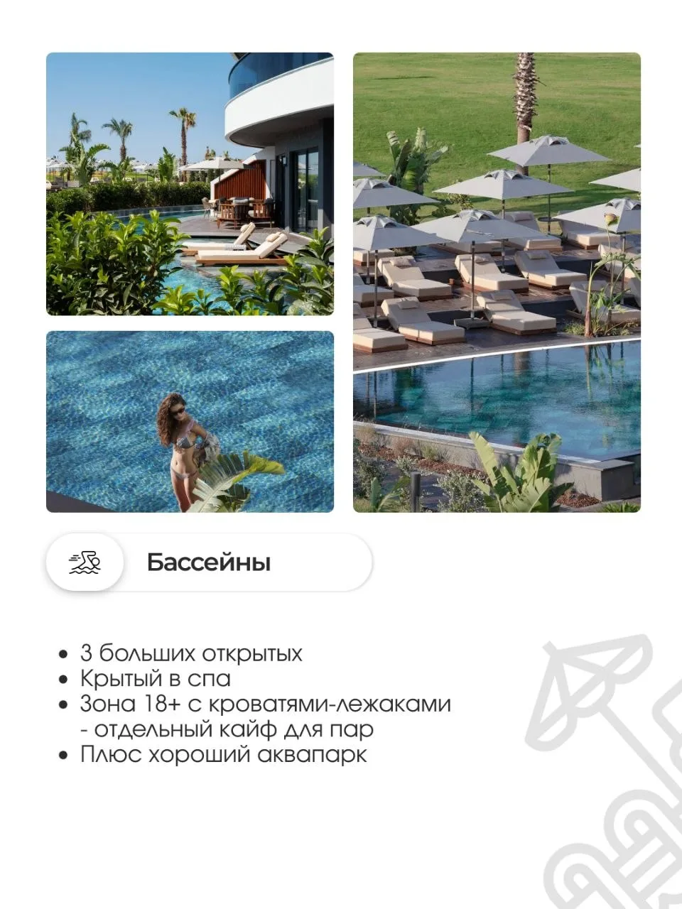 Три больших открытых + крытый в спа. Зона 18+ с кроватями-лежаками - отдельный кайф для пар, хороший аквапарк.