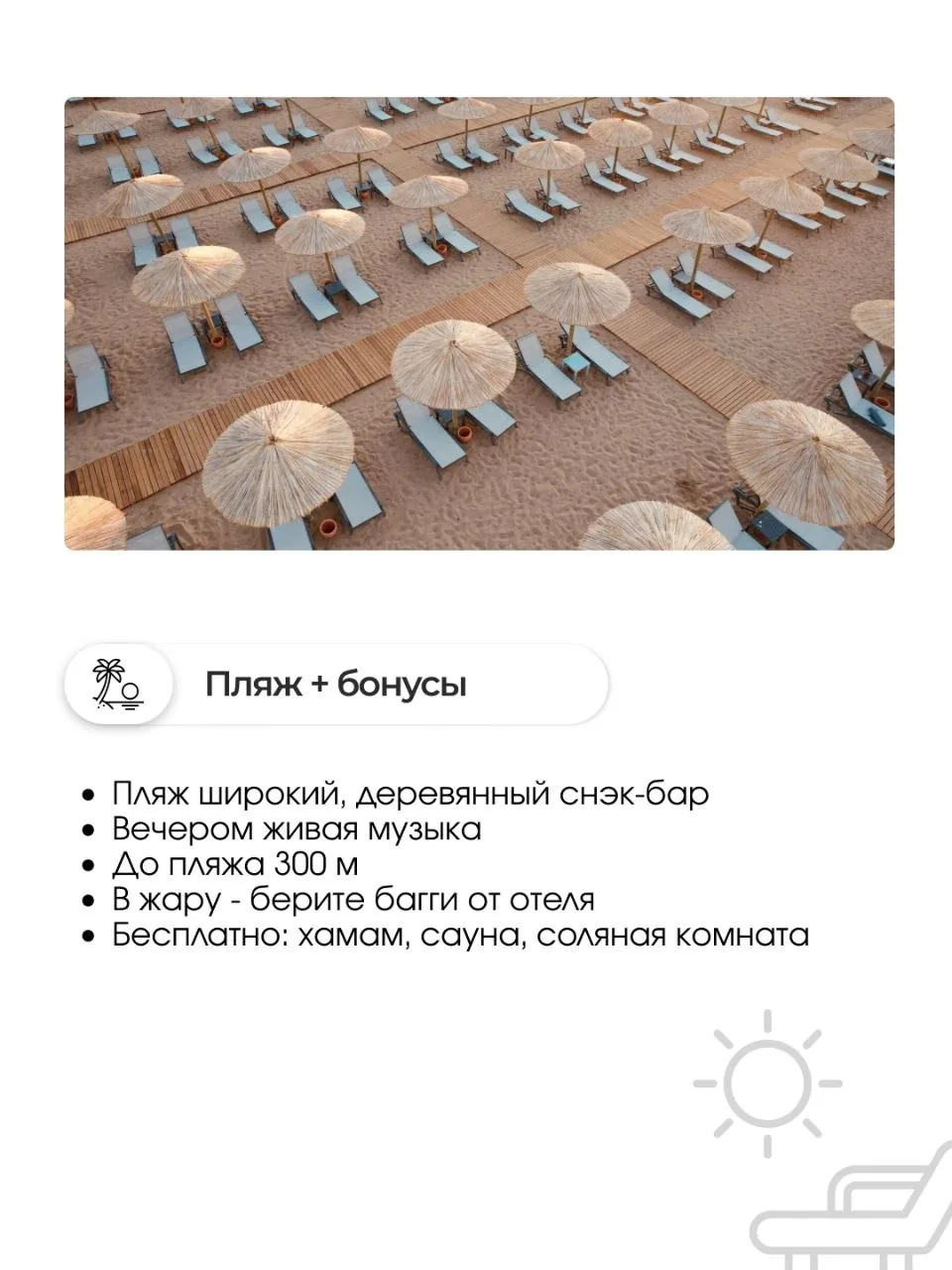 ✅Пляж. Широкий, деревянный снэк-бар, вечером живая музыка. До него 300 метров - Гугл врёт про 900. В жару берите багги от отеля.