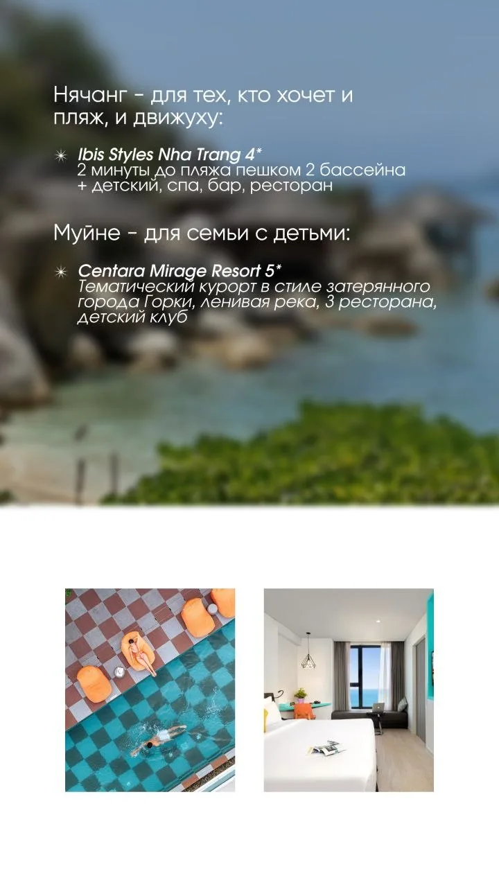 🏨 Centara Mirage Resort Mui Ne 5 Муйне,* тематический курорт в стиле затерянного города. Целый водный комплекс: горки, ленивая река, зона для прыжков, несколько бассейнов. Плюс 3 ресторана, детский клуб, спа. Беспроигрышный вариант для семьи.