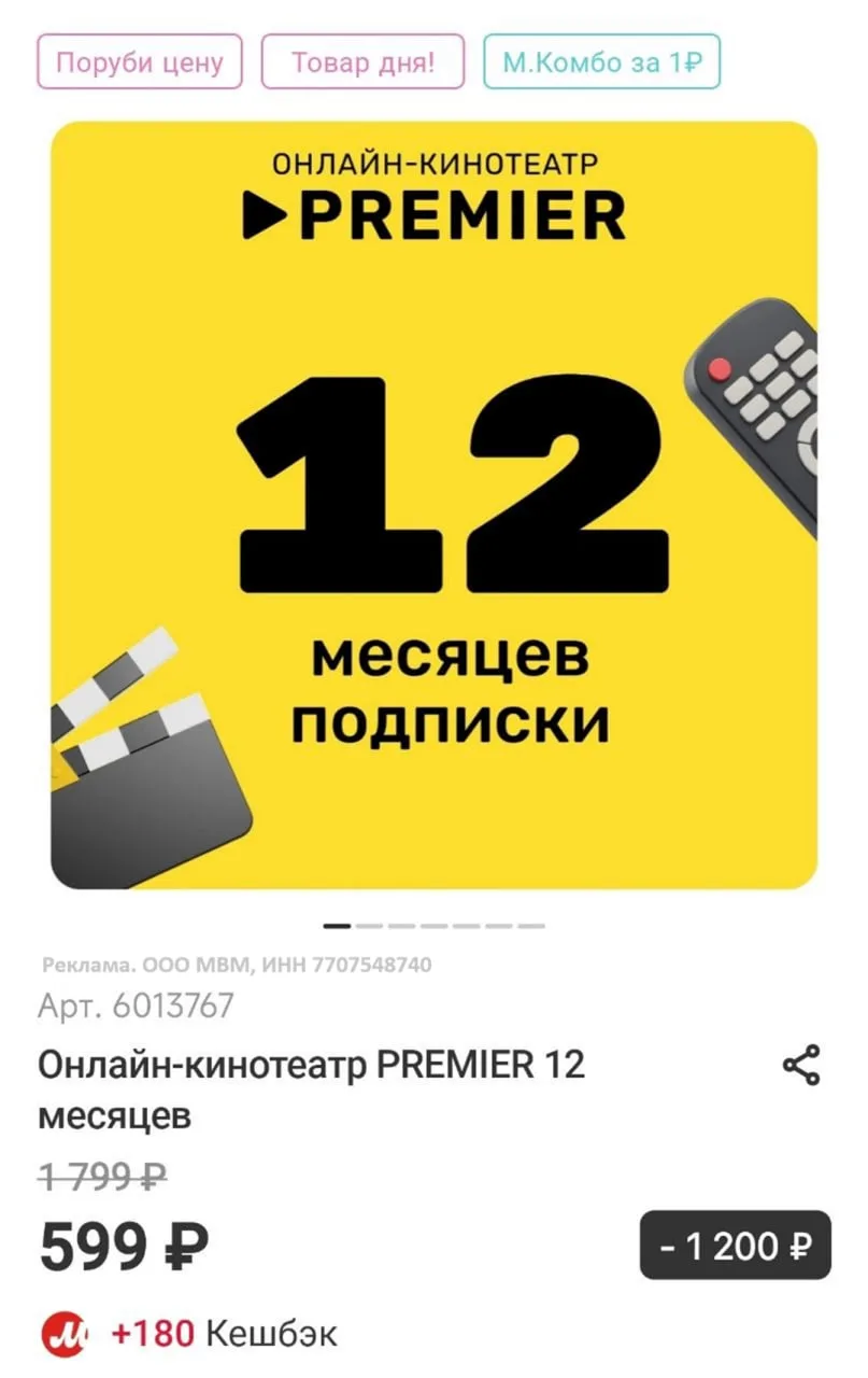 Онлайн-кинотеатр PREMIER 12 месяцев за 599₽ в М.Видео —…