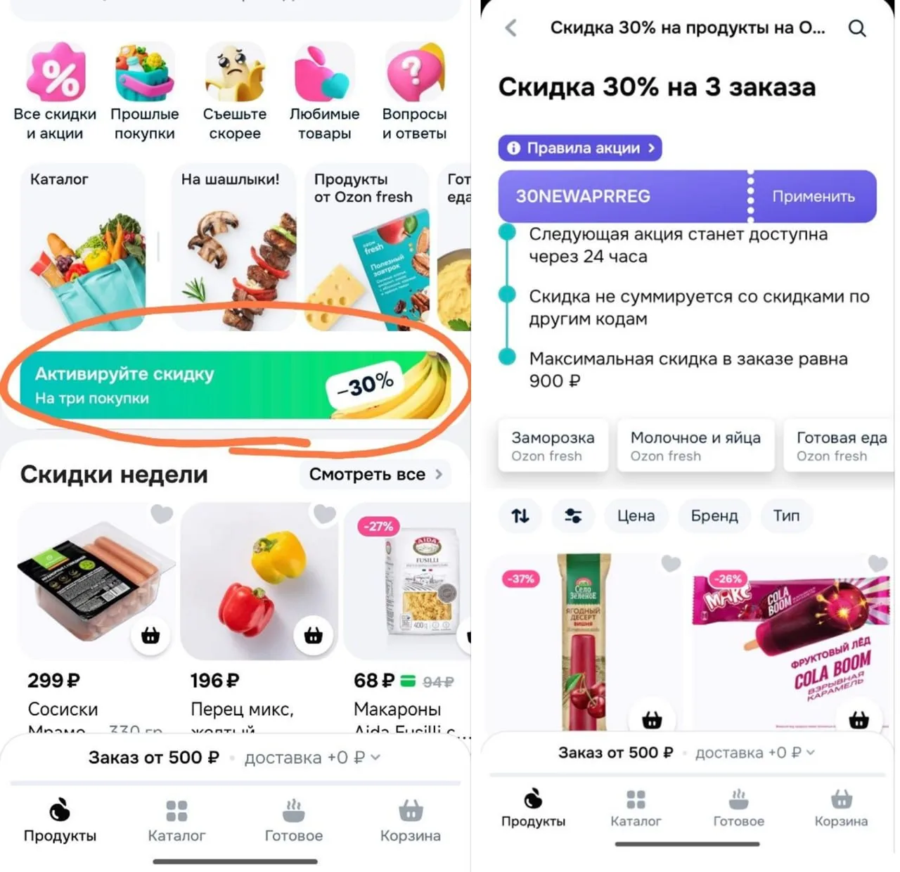 Скидка 30% на 3 заказа продуктов в OZON Fresh🔥