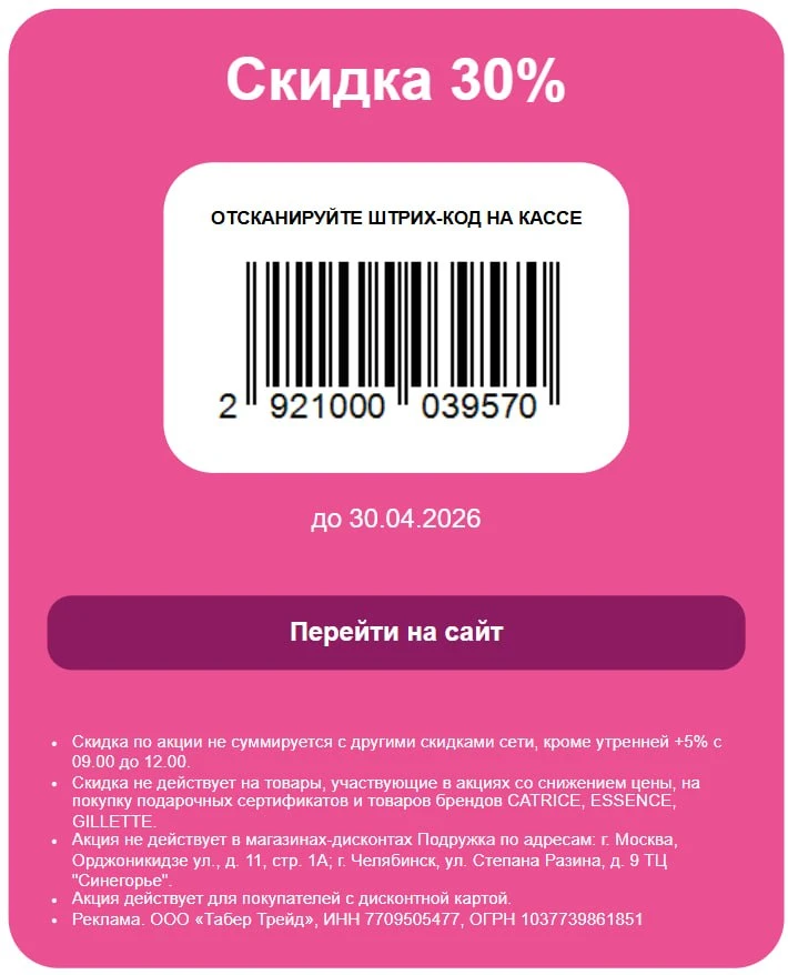 Для заказа онлайн на сайте используем промик: 2921000039570