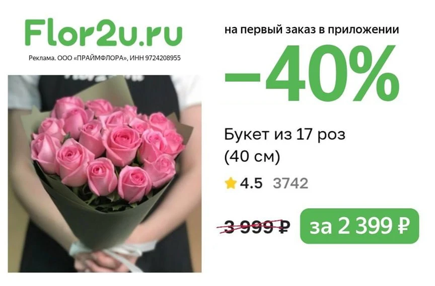 Скидка 40% по промокоду на первый заказ в приложении Flor2u🔥