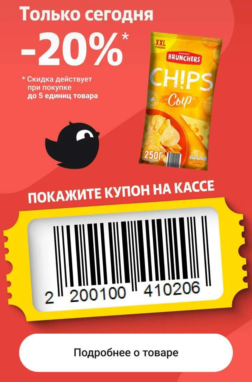 ● Купон на скидку 20% в Чижике на чипсы Brunchers