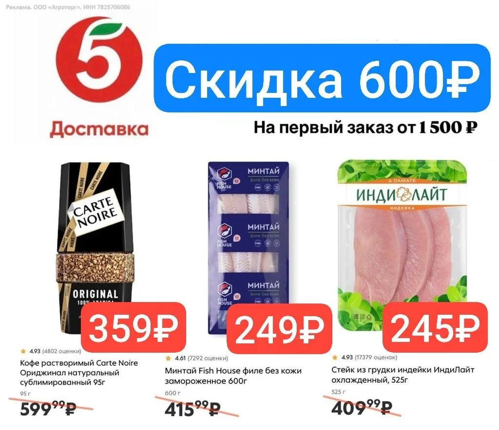 Новая скидка 600₽ от 1 500₽ при заказе в Пятёрочка Доставка🔥
