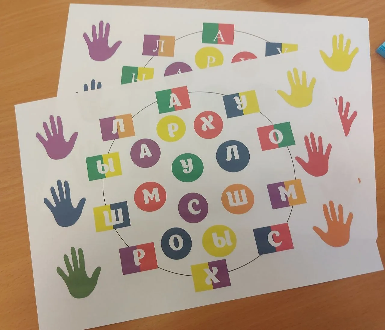 3️⃣ буквы внутри круга написаны на однотонном фоне. Здесь работаем немножко по-другому, тренируем переключаемость внимания: одной рукой букву, а другой цветную ладошку.
