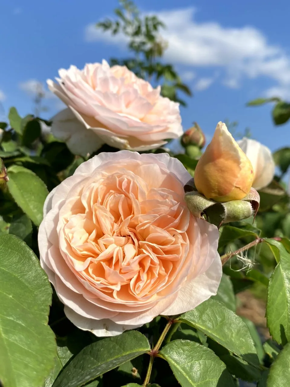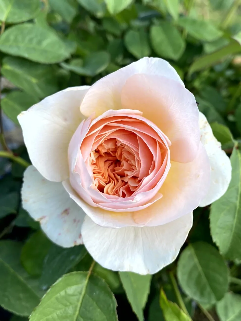Роза английская Свит Джульет (Sweet Juliet (AUSleap)) — спокойный, аккуратный сорт с очень приятной, тёплой окраской 🌿 Центр цветка абрикосово-персиковый, а внешние лепестки светлее, почти кремовые.