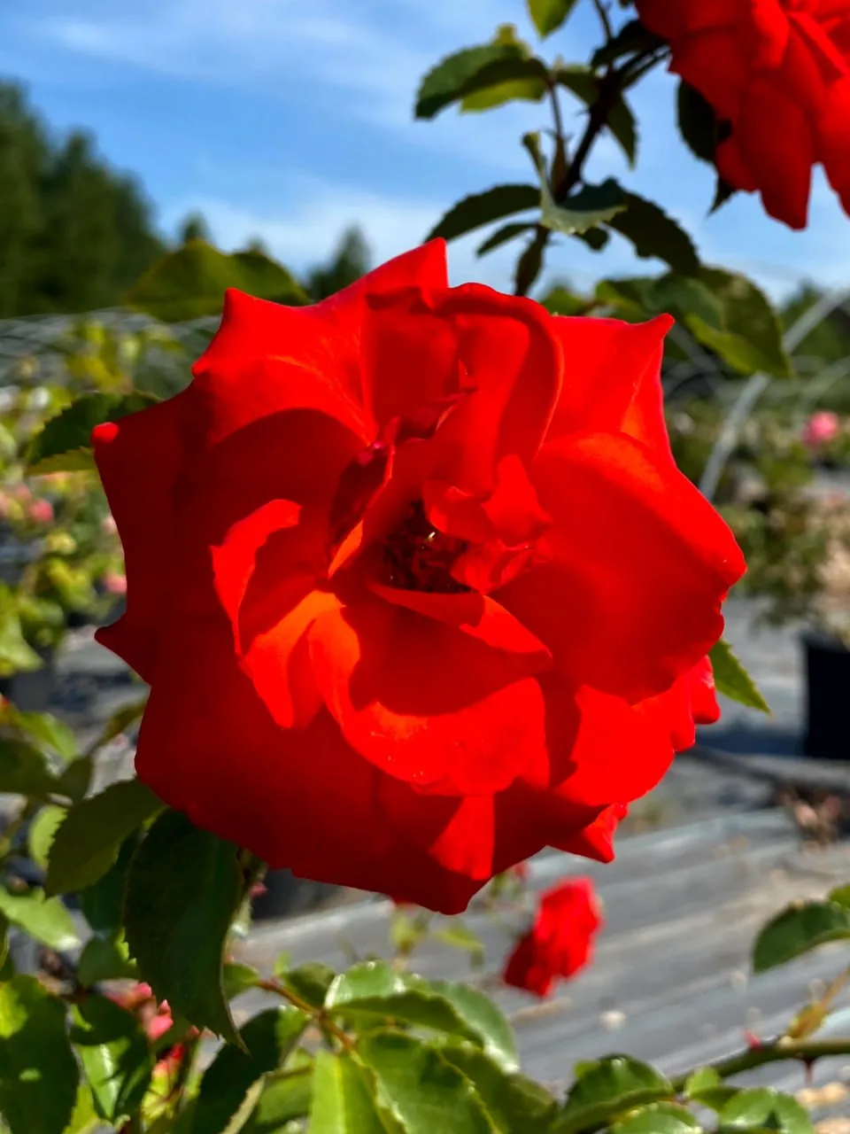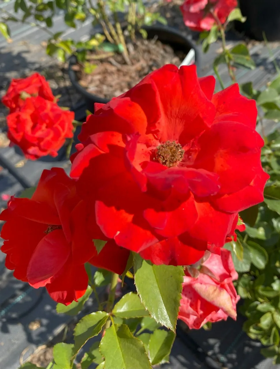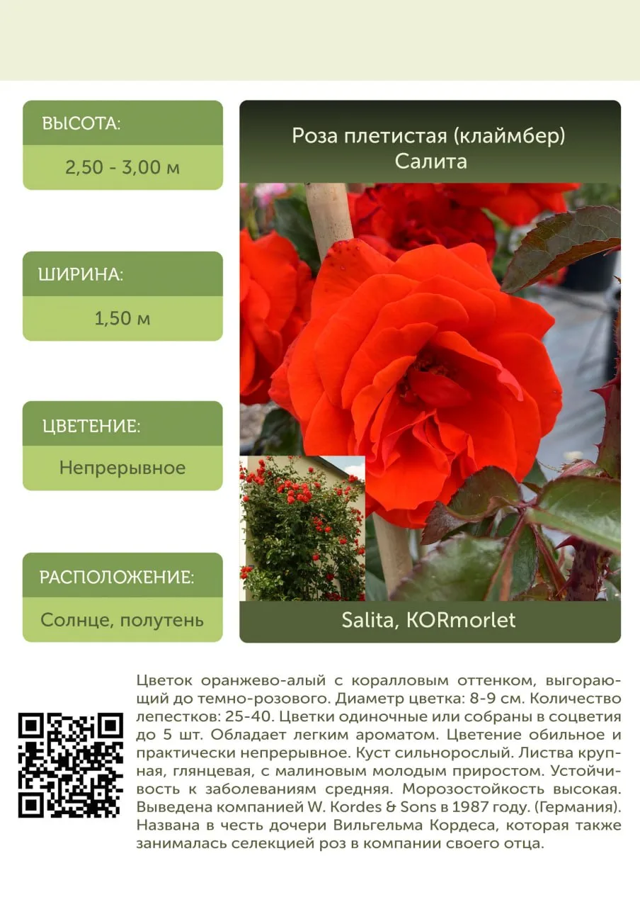 Роза плетистая (клаймбер) Салита (Salita (KORmorlet)) — яркий акцентный сорт с насыщенно оранжево-алым цветом и коралловым оттенком 🔥 Со временем цвет может слегка смягчаться до розоватого, но куст всё равно выглядит выразительно и заметно.