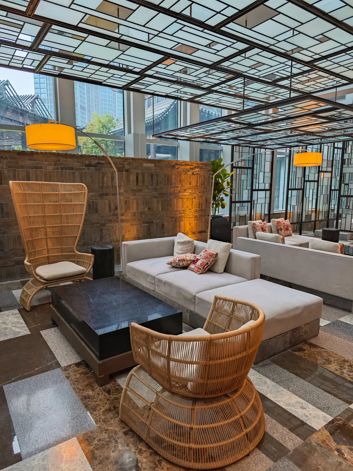 Если в двух словах, то это целый городок под одной крышей. Зелёный сад с беседками, пальмы, большой бассейн, горячие ванны (есть даже отдельные, как японские онсены), сауна – и всё это для постояльцев бесплатно. Прямо из отеля можно пройти в огромный торговый центр К11 с кучей магазинов, супермаркетом и фудкортом. И даже выходить на улицу не надо было.