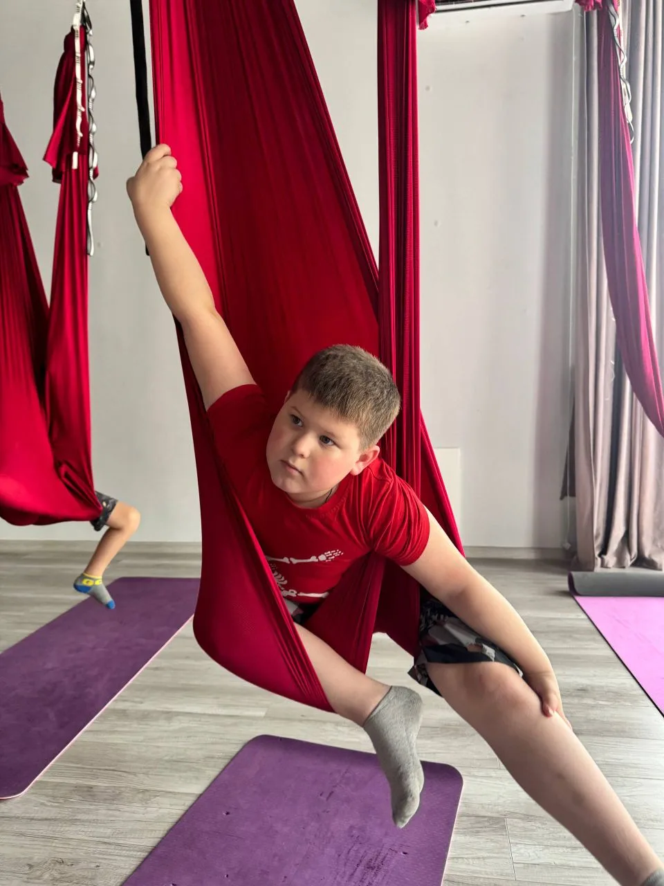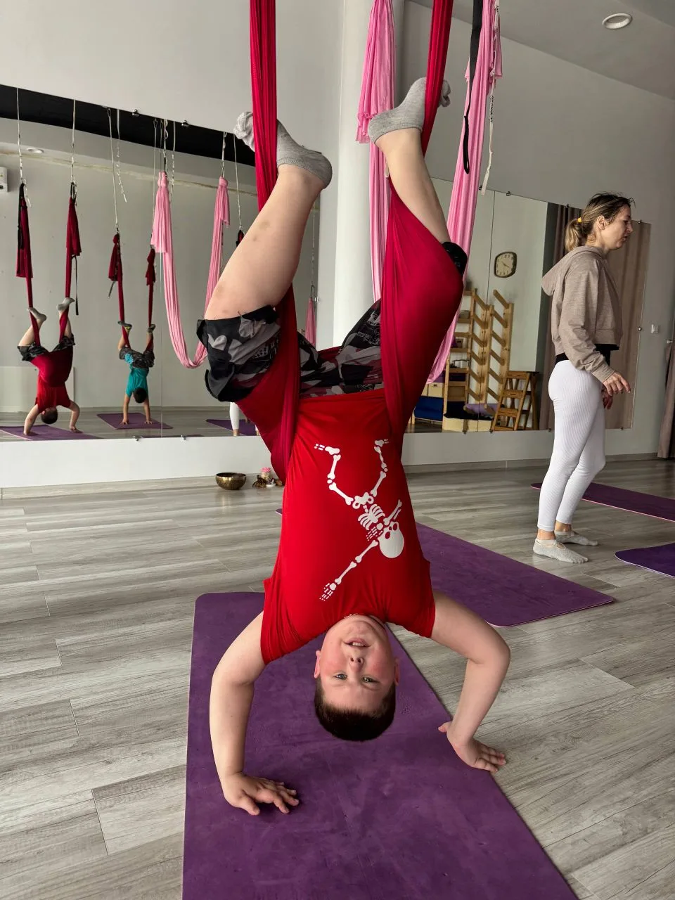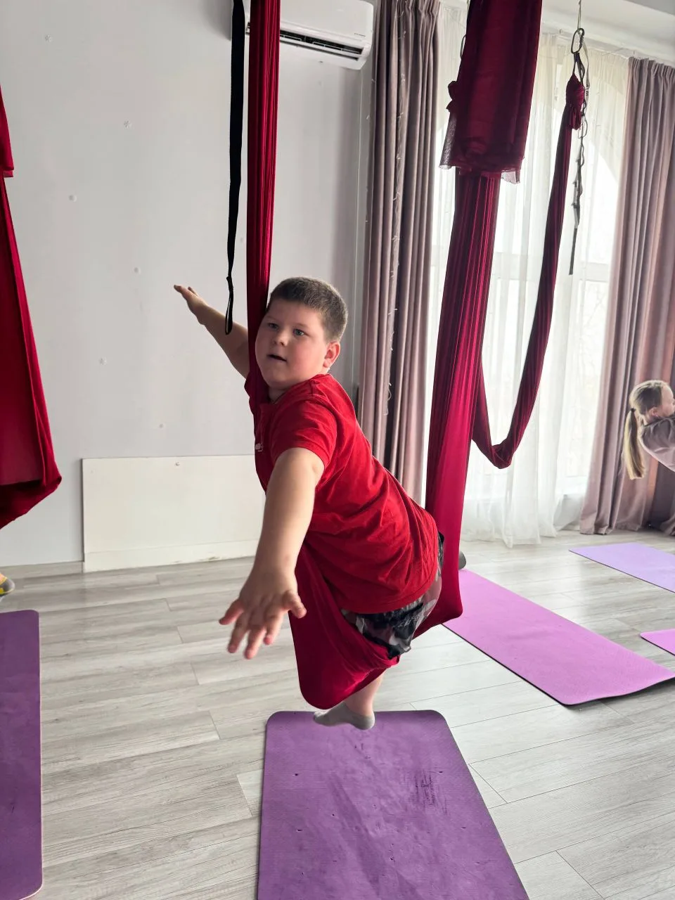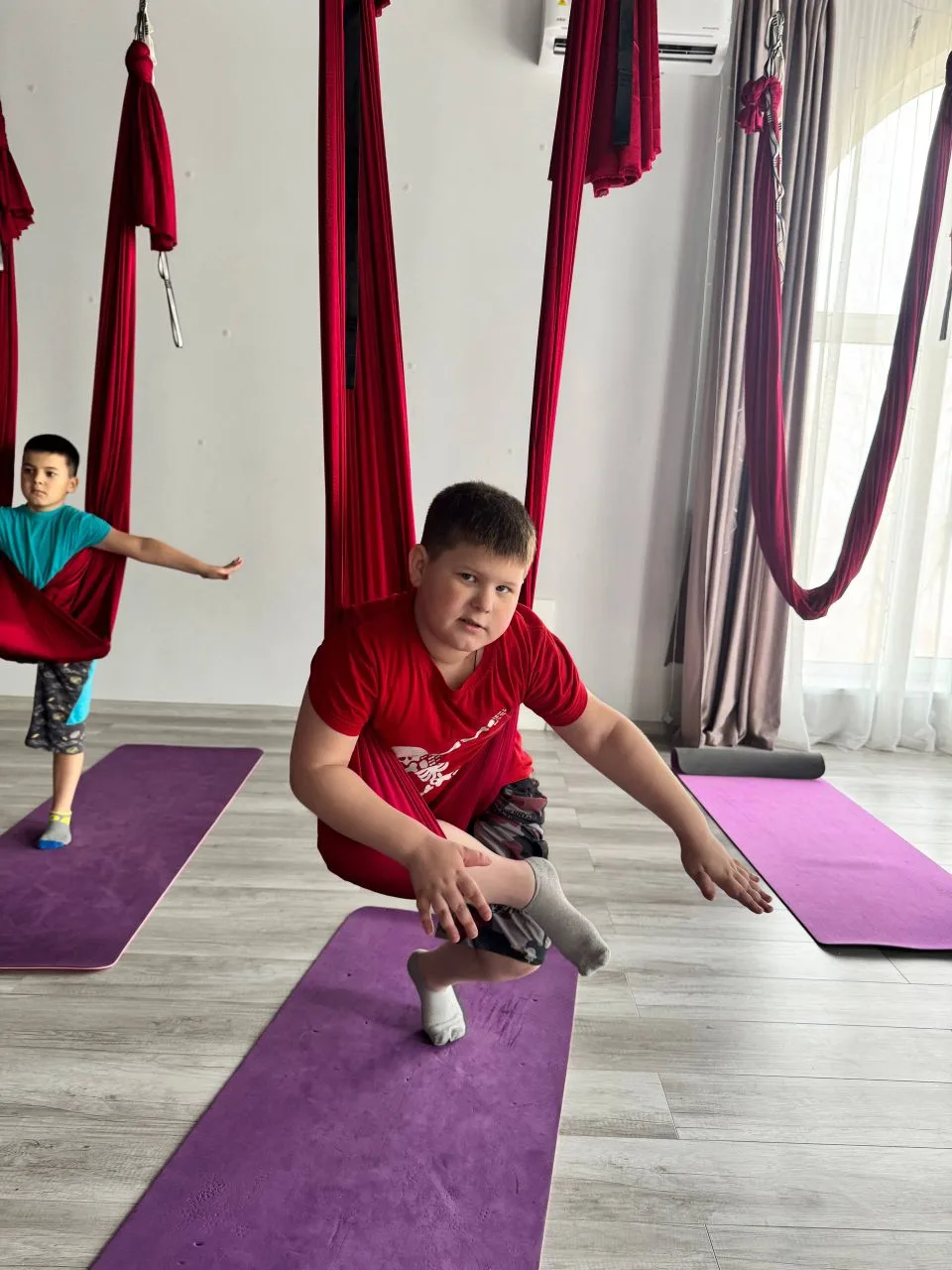 Мальчики продолжают ходить на аэройогу, им ооочень нравится)))