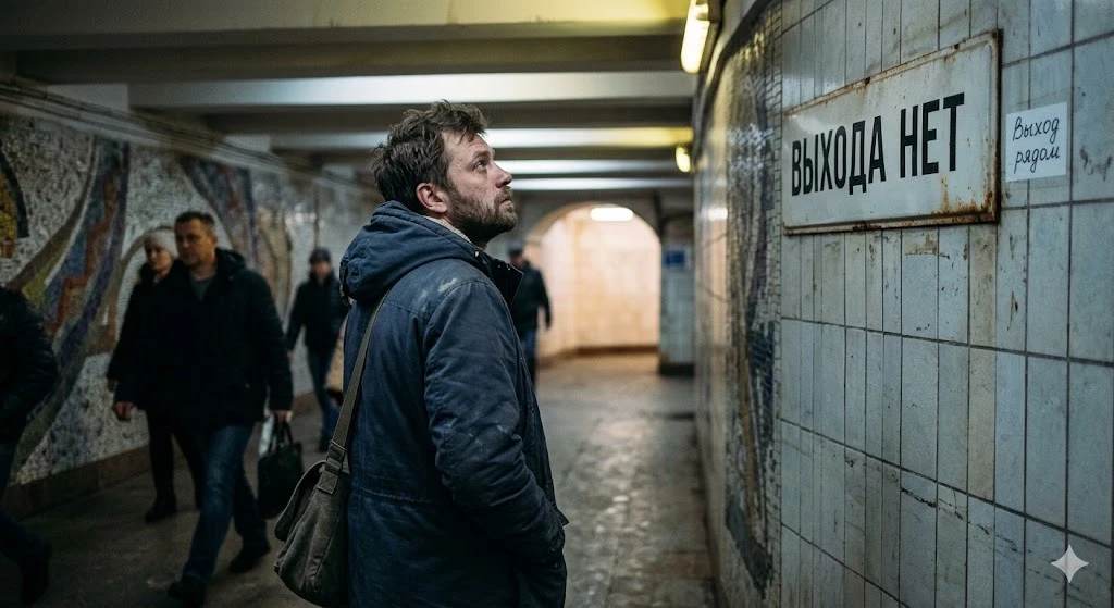 Представьте человека, у которого последние месяцы — сплошная полоса испытаний. Работа рухнула. Отношения дали трещину. Здоровье подводит. Деньги заканчиваются. Он едет в метро, смотрит в пол, и вдруг поднимает глаза — а там табличка: «Выхода нет».