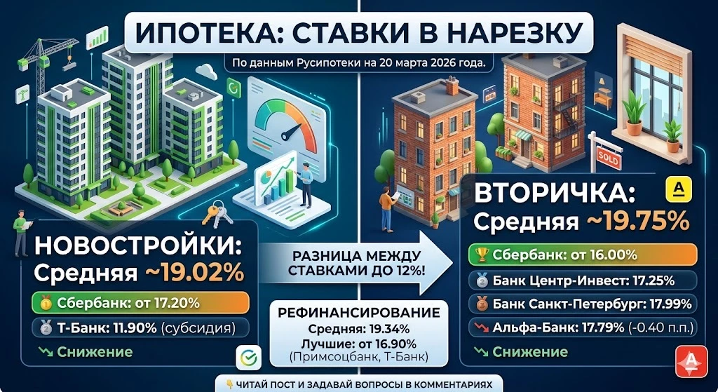 Новостройка. — средняя 19,02%. Здесь снова Сбербанк задаёт планку — 17,20%. Это минимум среди банков высшей лиги по рыночным программам. Т-Банк предлагает 11,90%, но это субсидированная ставка от застройщика — отдельная история со своими нюансами.