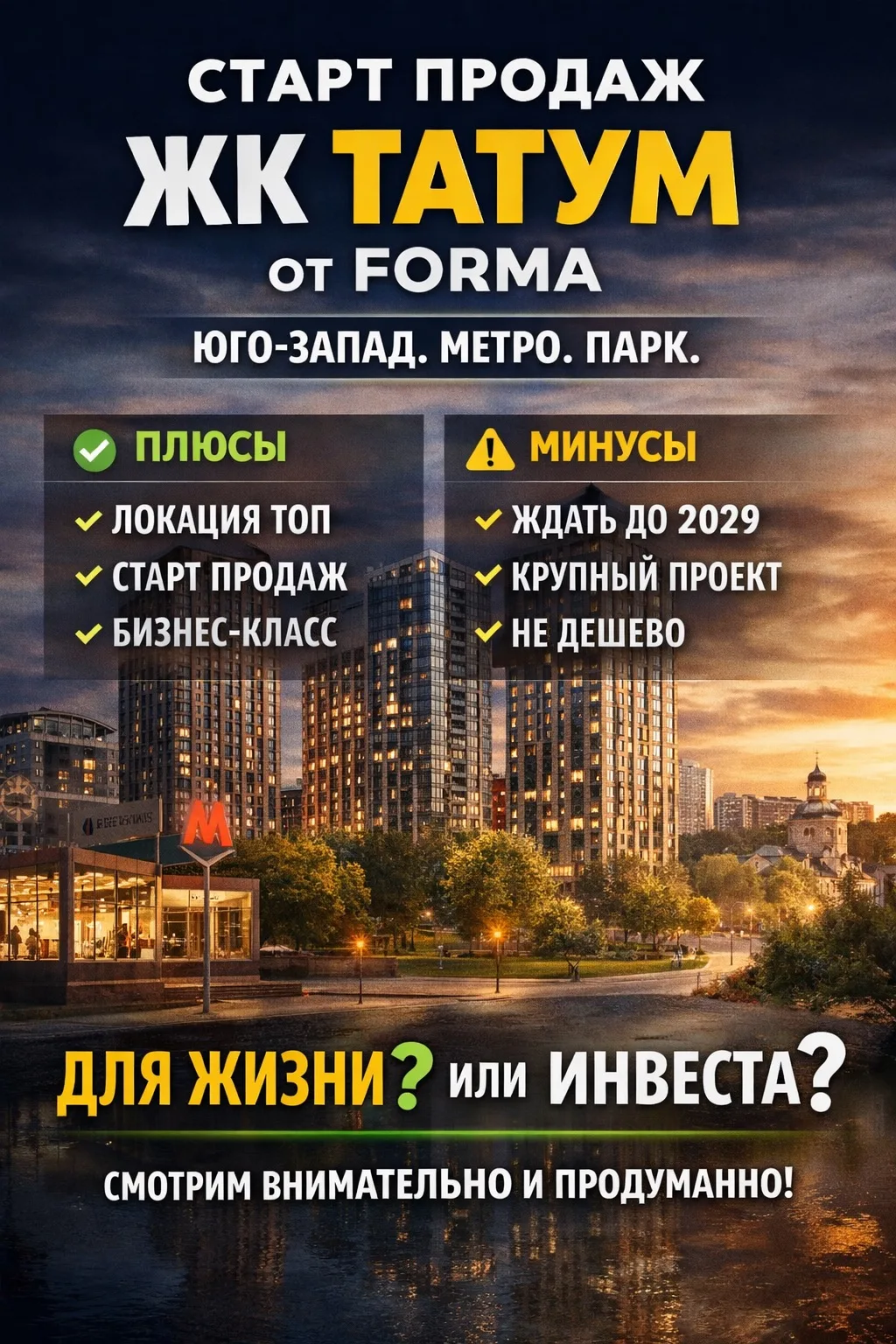 Мой вывод такой: ТАТУМ выглядит как сильный проект для жизни на Юго-Западе и как потенциально интересный вариант для покупки на старте, если выбирать квартиру точечно — по корпусу, планировке, этажу и цене входа.