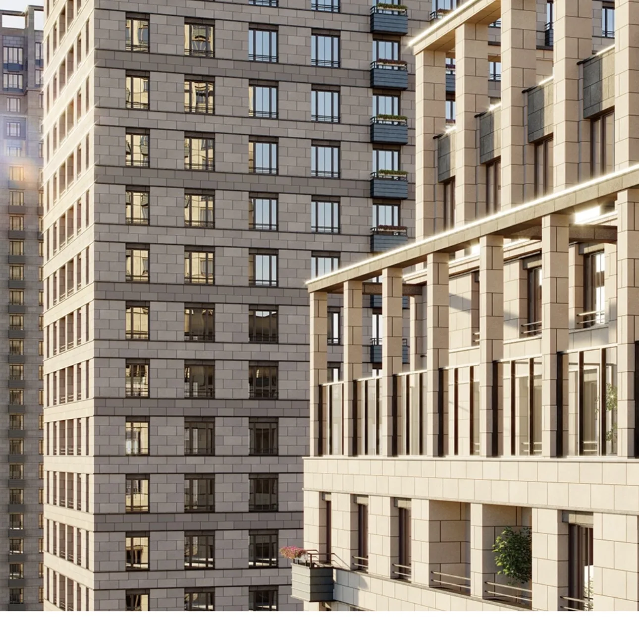 Неоклассика: фасады из керамогранита, высота до 31 этажа, качественные входные группы. Внутри — высокие потолки (до 2,7 м), в 90% квартир есть балконы или лоджии.