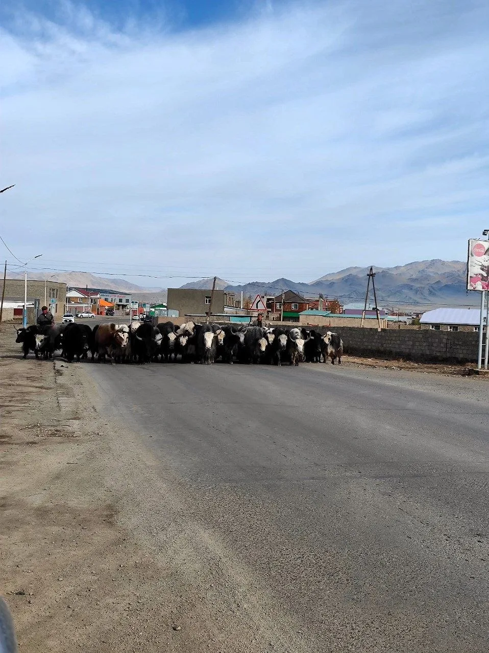 Здесь очень мало людей. 3,5 млн человек живут во всей Монголии. Это в 4 раза меньше, чем в Москве, при том, что площадь Монголии в 600 раз больше площади Москвы. Плотность населения Монголии - 1,7 чел/кв.км. Карл?! Понимаете, да? Единственная пробка, которая может случиться это, если яки или козы решат перейти дорогу.