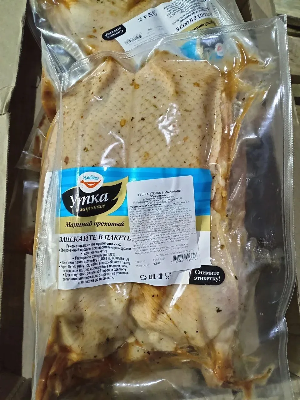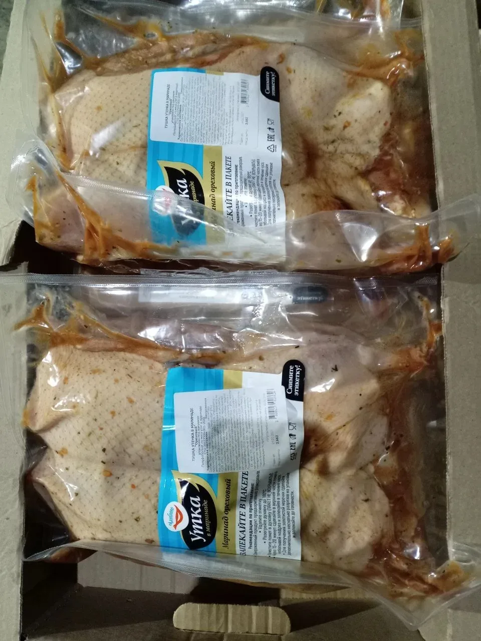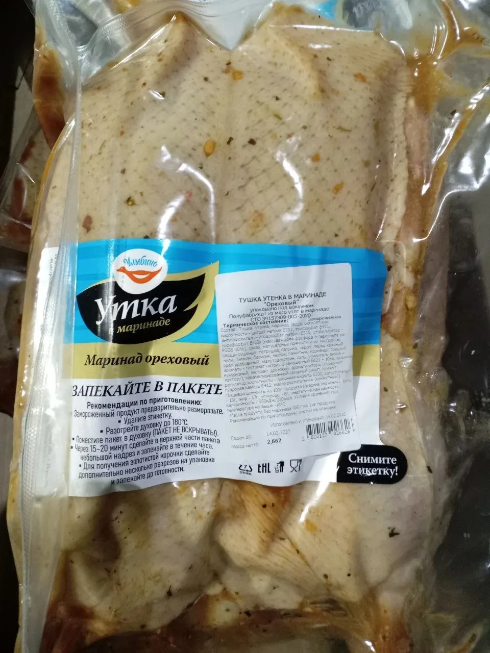В маринаде: дробленый грецкий орех, чеснок, паприка, петрушка, тимьян и другие пряности. Никаких лишних ингредиентов - только насыщенный вкус, который подчеркивает нежность утки, а не перебивает ее.