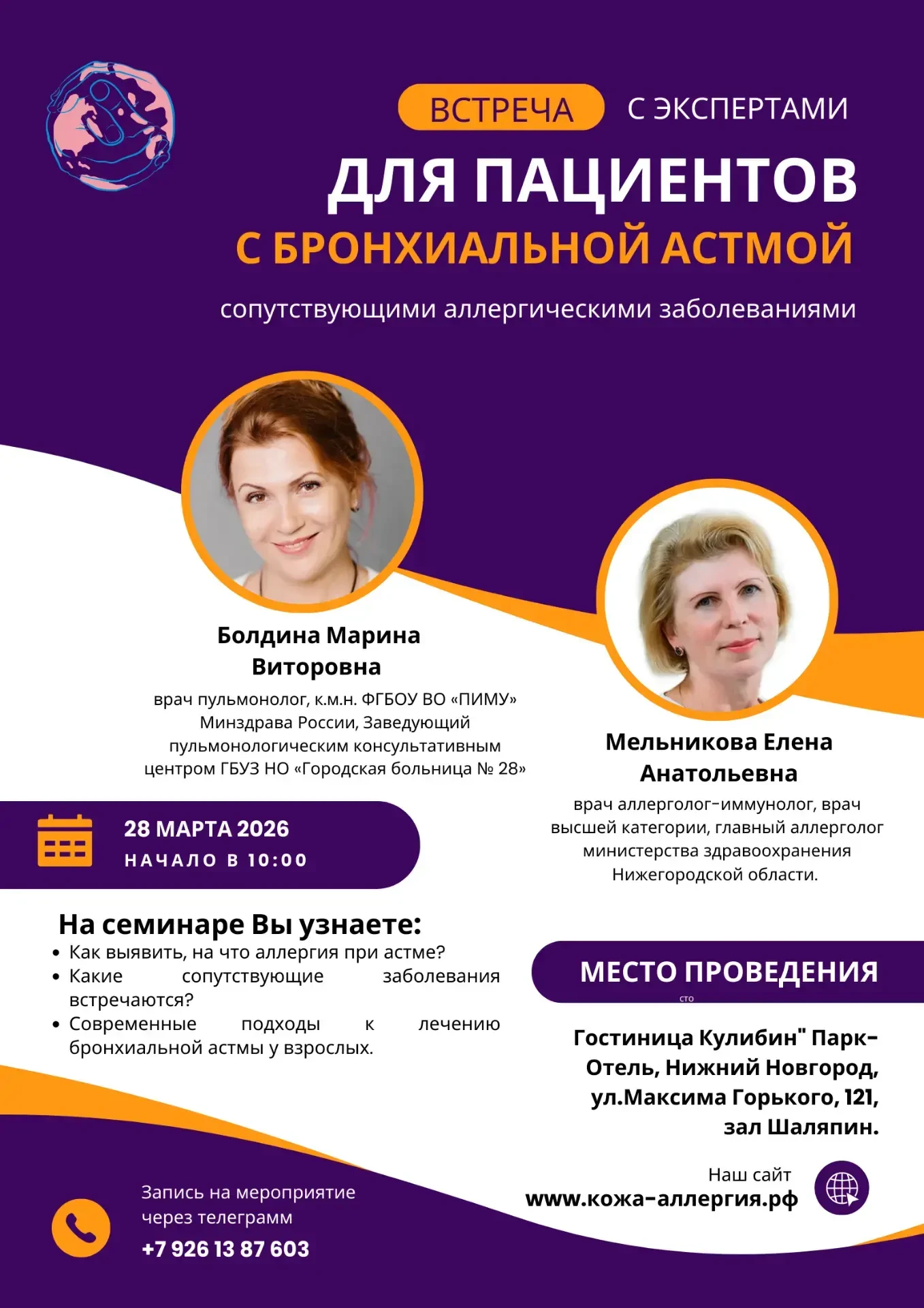 28 марта 2026 года в г.Нижний Новгород состоится семинар для пациентов с бронхиальной астмой.