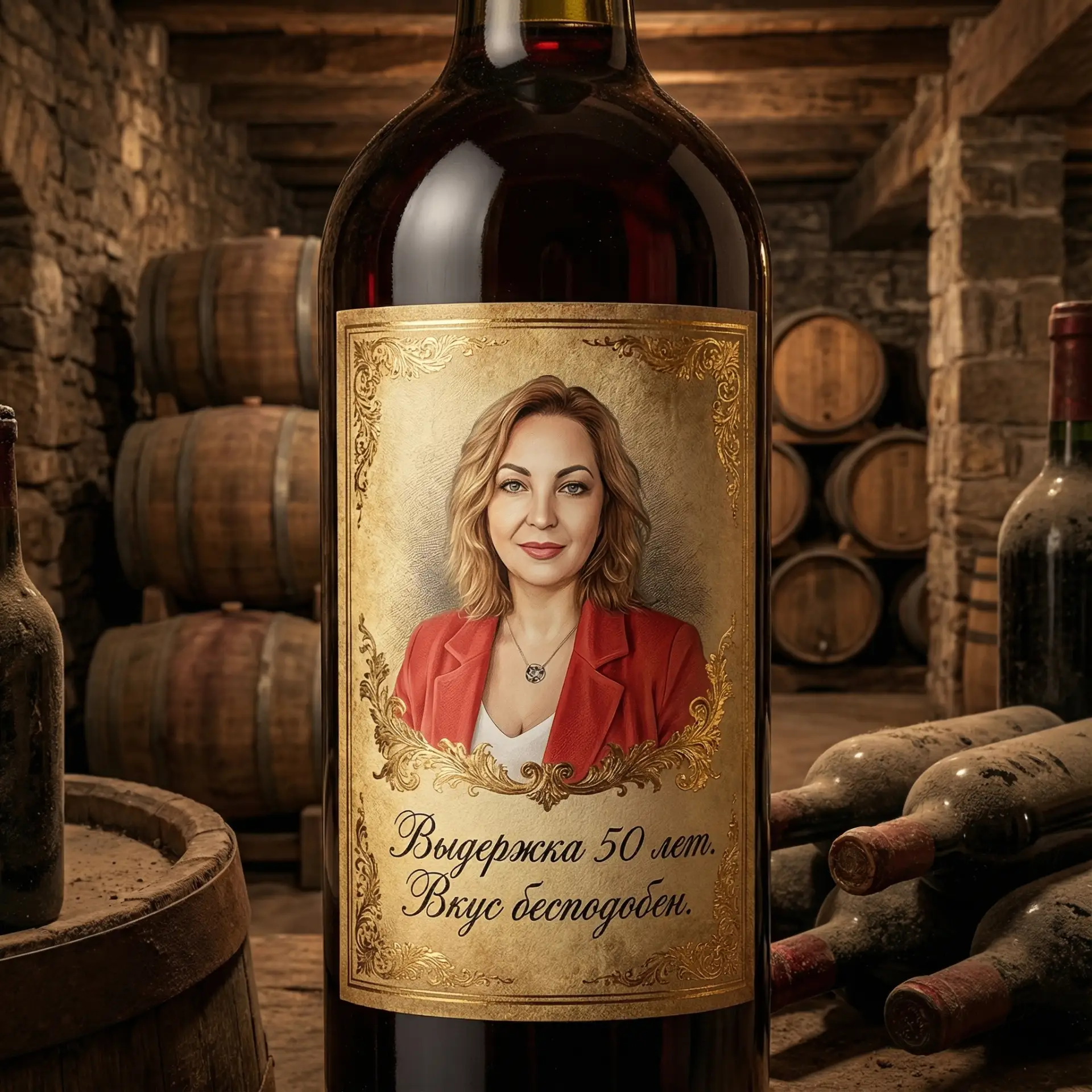 Vertical creative design. A bottle of expensive vintage wine. On the label is a portrait of [Reference Image] A woman from the provided photo, do not change facial features and body parameters, looking elegant. Background is a wine cellar. Text in Russian on the label: "Выдержка 50 лет. Вкус бесподобен." Впиши текст в изображение максимально органично, начертание необычное