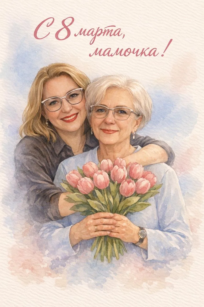 «Создай нежную поздравительную открытку в стиле акварельной иллюстрации на основе прикрепленного фото. Люди на открытке должны быть максимально похожи на людей на исходной фотографии — сохранить черты лица, прически, выражение лица. На изображении молодая девушка нежно обнимает маму сзади. Мама держит в руках букет розовых тюльпанов. Атмосфера тёплая, трогательная, семейная. Стиль — мягкая акварельная иллюстрация. Пастельные цвета, нежные розовые и голубые оттенки. Фон минималистичный, с акварельным градиентом. Оставить место для надписи «С 8 марта мамочка» в красивом рукописном стиле.»