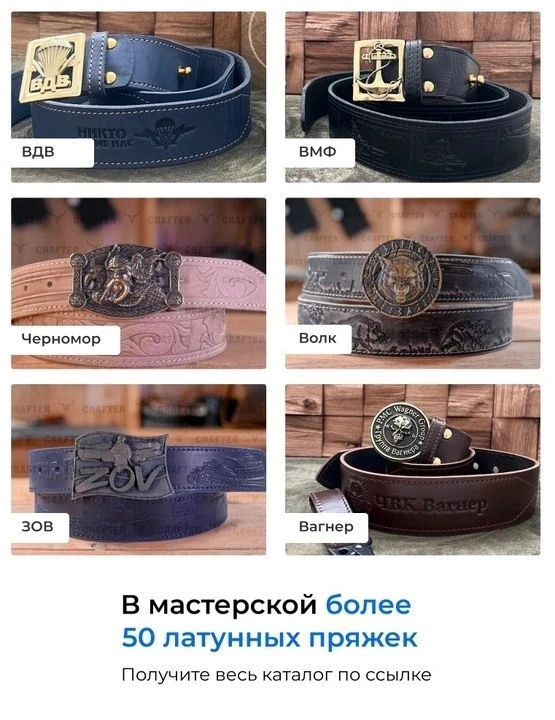 В мастерской большой выбор ремней и более 50 моделей. Офицерские, тематические, классические и другие.
